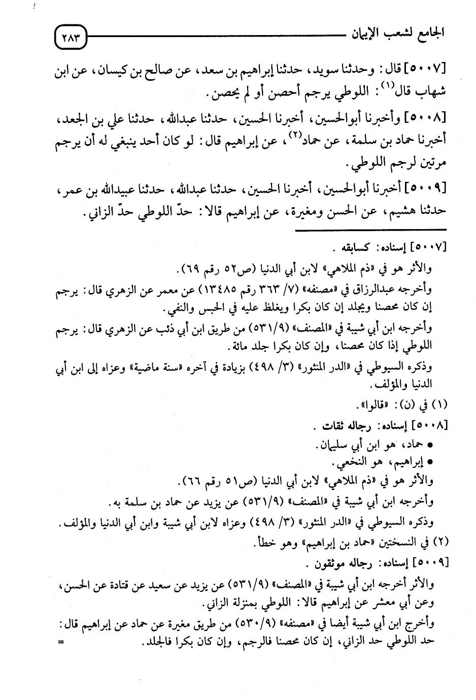 5007 - قَالَ: وَثَنًا سُوَيْدٌ، ثنا إِبْرَاهِيمُ بْنُ سَعْدٍ، عَنْ صَالِحِ بْنِ كَيْسَانَ، عَنِ ابْنِ شِهَابٍ، قَالَ: §" اللُّوطِيُّ يُرْجَمُ أُحْصِنَ أَوْ لَمْ يُحْصَنْ "