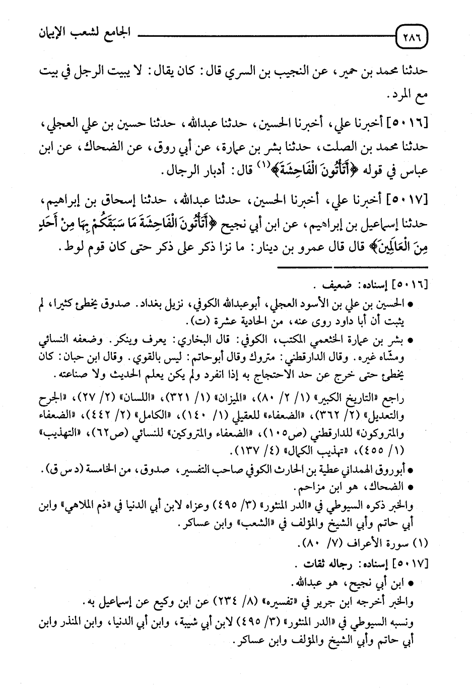 5016 - أَخْبَرَنَا عَلِيٌّ، أنا الْحُسَيْنُ، أنا عَبْدُ اللهِ، ثنا الْحُسَيْنُ بْنُ عَلِيٍّ الْعِجْلِيُّ، ثنا مُحَمَّدُ بْنُ الصَّلْتِ، ثنا بِشْرُ بْنُ عُمَارَةَ، عَنْ أَبِي رَوْقٍ، عَنِ الضَّحَّاكِ، عَنِ ابْنِ عَبَّاسٍ، فِي قَوْلِهِ: {§أَتَأْتُونَ الْفَاحِشَةَ} [الأعراف: 80] قَالَ: " أَدْبَارِ الرِّجَالِ "
