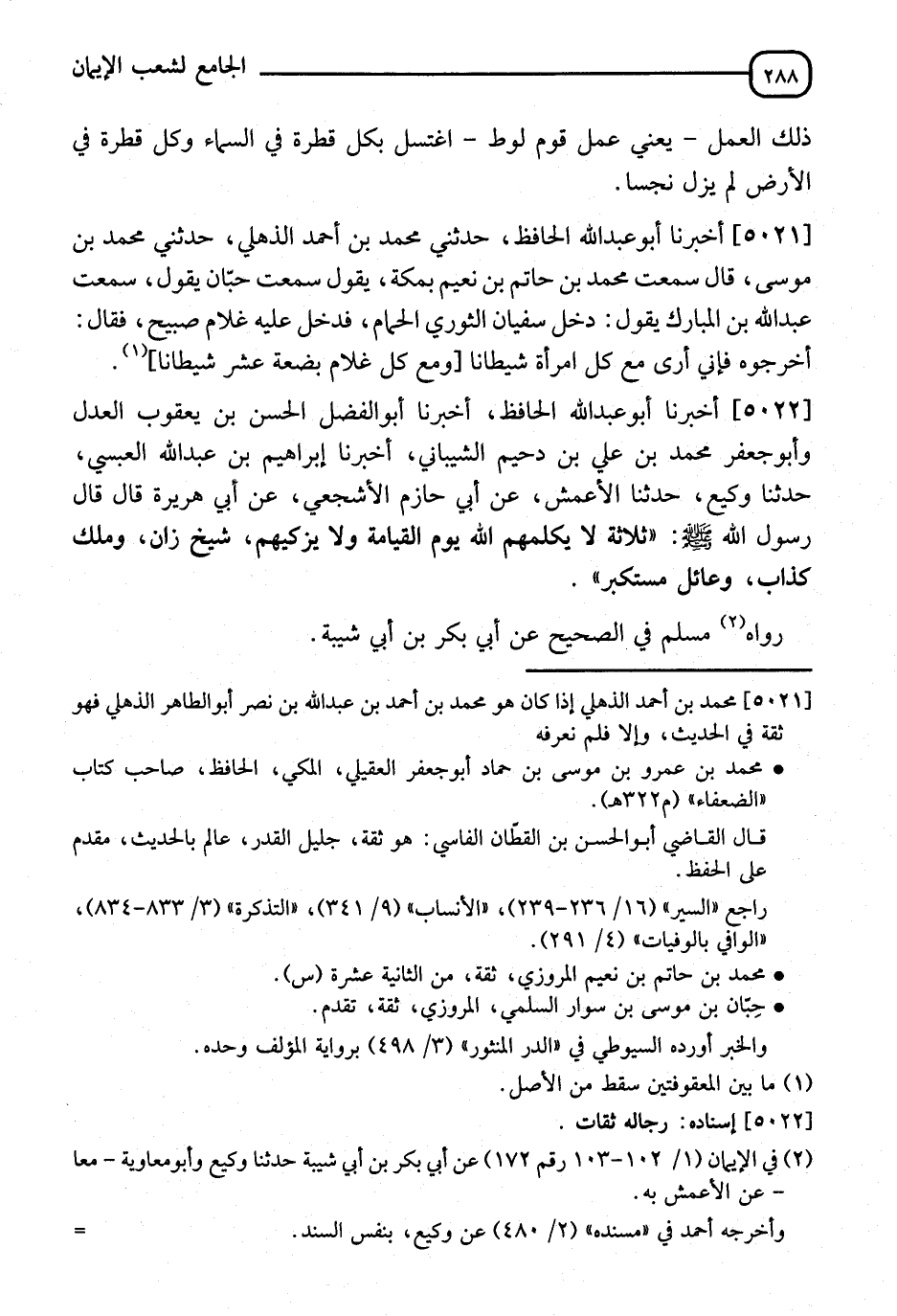 5022 - أَخْبَرَنَا أَبُو عَبْدِ اللهِ الْحَافِظُ، أنا أَبُو الْفَضْلِ الْحَسَنُ بْنُ يَعْقُوبَ الْعَدْلُ، وَأَبُو جَعْفَرٍ مُحَمَّدُ بْنُ عَلِيِّ بْنِ دُحَيْمٍ الشَّيْبَانِيُّ، أنا إِبْرَاهِيمُ بْنُ عَبْدِ اللهِ الْعَبْسِيُّ، ثنا وَكِيعٌ، ثنا الْأَعْمَشُ، عَنْ أَبِي حَازِمٍ الْأَشْجَعِيِّ، عَنْ أَبِي هُرَيْرَةَ، قَالَ: قَالَ رَسُولُ اللهِ صَلَّى اللَّهُ عَلَيْهِ وَسَلَّمَ: " §ثَلَاثَةٌ لَا يُكَلِّمُهُمُ اللهُ يَوْمَ الْقِيَامَةِ وَلَا يُزَكِّيهِمْ: شَيْخٌ زَانٍ، وَمَلِكٌ كَذَّابٌ، وَعَائِلٌ مُسْتَكْبِرٌ ". رَوَاهُ مُسْلِمٌ فِي الصَّحِيحِ، عَنْ أَبِي بَكْرِ بْنِ أَبِي شَيْبَةَ
