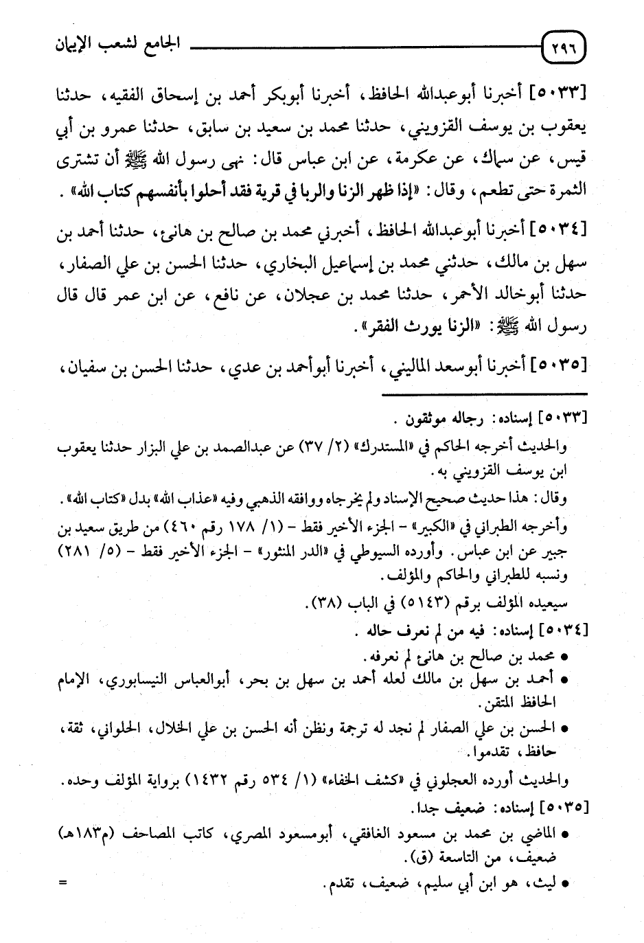 5033 - أَخْبَرَنَا أَبُو عَبْدِ اللهِ الْحَافِظُ، أنا أَبُو بَكْرٍ مُحَمَّدُ بْنُ إِسْحَاقَ الْفَقِيهُ، ثنا يَعْقُوبُ بْنُ يُوسُفَ الْقَزْوِينِيُّ، ثنا مُحَمَّدُ بْنُ سَعِيدِ بْنِ سَابَقٍ، ثنا عَمْرُو بْنُ أَبِي قَيْسٍ، عَنْ سِمَاكٍ، عَنْ عِكْرِمَةَ، عَنِ ابْنِ عَبَّاسٍ، قَالَ: نَهَى رَسُولُ اللهِ أَنْ يُشْتَرَى الثَّمَرُ حَتَّى يُطْعِمَ، وَقَالَ: §" إِذَا ظَهَرَ الزِّنَا وَالرِّبَا فِي قَرْيَةٍ فَقَدْ حَلُّوا بِأَنْفُسِهِمْ كِتَابَ اللهِ "