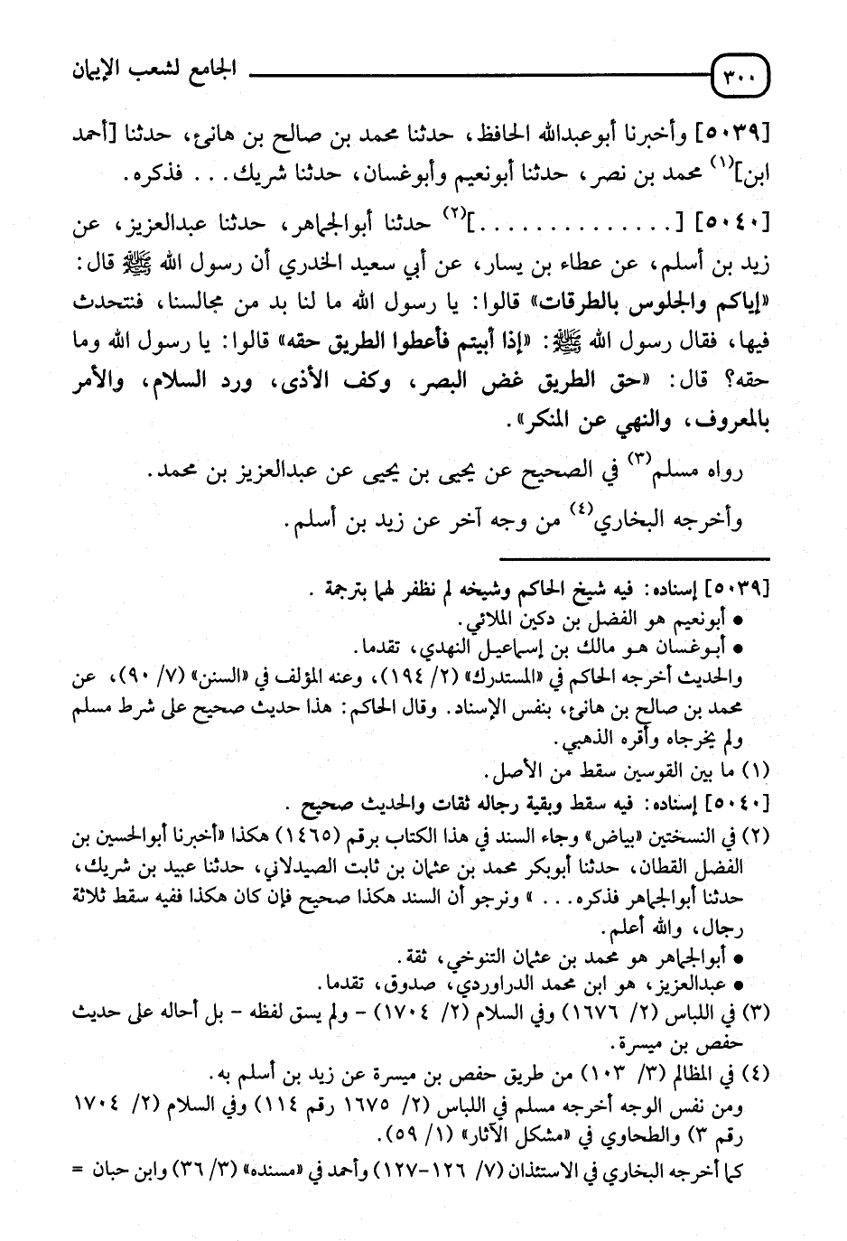5040 - ثنا أَبُو الْجُمَاهِرِ، ثنا عَبْدُ الْعَزِيزِ، عَنْ زَيْدِ بْنِ أَسْلَمَ، عَنْ عَطَاءِ بْنِ يَسَارٍ، عَنْ أَبِي سَعِيدٍ الْخُدْرِيِّ، أَنَّ رَسُولَ اللهِ صَلَّى اللَّهُ عَلَيْهِ وَسَلَّمَ قَالَ:" إِيَّاكُمْ وَالْجُلُوسَ بِالطُّرُقَاتِ" قَالُوا: يَا رَسُولَ اللهِ، مَا لَنَا بُدٌّ مِنْ مَجَالِسِنَا نَتَحَدَّثُ فِيهَا؟ فَقَالَ رَسُولُ اللهِ صَلَّى اللَّهُ عَلَيْهِ وَسَلَّمَ:" إِذَا أَبَيْتُمْ فَأُعْطُوا الطَّرِيقَ حَقَّهُ" قَالُوا: يَا رَسُولَ اللهِ، وَمَا حَقُّهُ؟ قَالَ:" §حَقُّ الطَّرِيقِ غَضُّ الْبَصَرِ، وَكَفُّ الْأَذَى، وَرَدُّ السَّلَامِ، وَالْأَمْرُ بِالْمَعْرُوفِ، وَالنَّهْيُ عَنِ الْمُنْكَرِ". رَوَاهُ مُسْلِمٌ فِي الصَّحِيحِ، عَنْ يَحْيَى بْنِ يَحْيَى، عَنْ عَبْدِ الْعَزِيزِ بْنِ مُحَمَّدٍ. وَأَخْرَجَهُ الْبُخَارِيُّ مِنْ وَجْهٍ آخَرَ، عَنْ زَيْدِ بْنِ أَسْلَمَ. -[301]- قَالَ الشَّيْخُ:" فَرُوِّينَا فِي حَدِيثِ عُبَادَةَ بْنِ الصَّامِتِ، عَنِ النَّبِيِّ صَلَّى اللَّهُ عَلَيْهِ وَسَلَّمَ:" احْفَظُوا فُرُوجَكُمْ، وَغُضُّوا أَبْصَارَكُمْ" فِيمَا ضَمِنَ لَهُمْ بِهِ الْجَنَّةَ، وَلَهُ شَاهِدٌ مُرْسَلٌ"