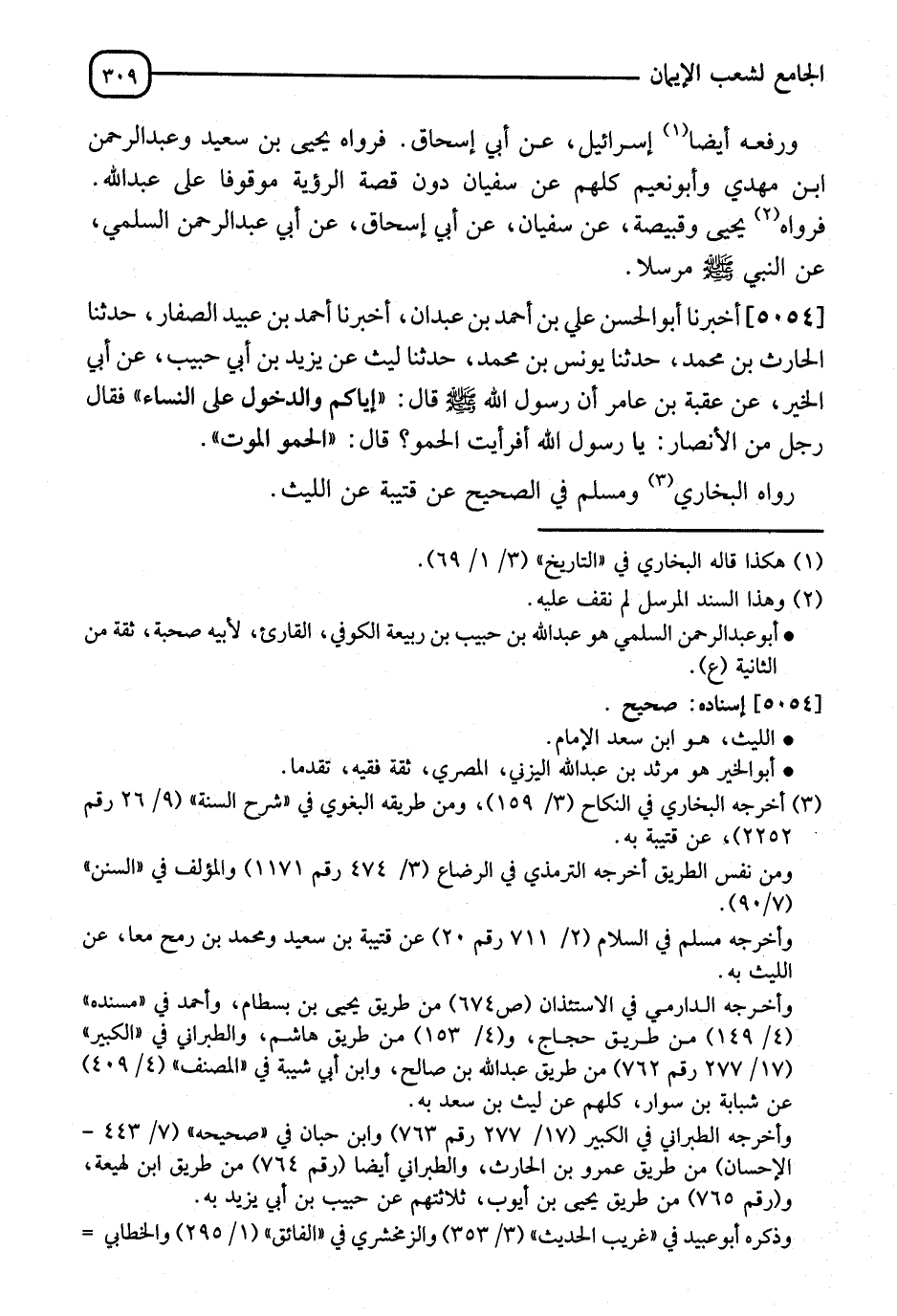 5054 - أَخْبَرَنَا أَبُو الْحَسَنِ عَلِيُّ بْنُ أَحْمَدَ بْنِ عَبْدَانَ، أنا أَحْمَدُ بْنُ عُبَيْدٍ الصَّفَّارُ، ثنا الْحَارِثُ بْنُ مُحَمَّدٍ، ثنا يُونُسُ بْنُ مُحَمَّدٍ، ثنا لَيْثٌ، عَنْ يَزِيدَ بْنِ أَبِي حَبِيبٍ، عَنْ أَبِي الْخَيْرِ، عَنْ عُقْبَةَ بْنِ عَامِرٍ، أَنَّ رَسُولَ اللهِ صَلَّى اللَّهُ عَلَيْهِ وَسَلَّمَ قَالَ: " §إِيَّاكُمْ وَالدُّخُولَ عَلَى النِّسَاءِ " فَقَالَ رَجُلٌ مِنَ الْأَنْصَارِ: يَا رَسُولَ اللهِ، أَفَرَأَيْتَ الْحَمْوَ؟ قَالَ: " الْحَمْوُ الْمَوْتُ " رَوَاهُ الْبُخَارِيُّ وَمُسْلِمٌ فِي الصَّحِيحِ، عَنْ قُتَيْبَةَ، عَنِ اللَّيْثِ. -[310]- قَالَ الشَّيْخُ: قَالَ أَبُو عُبَيْدَةَ: " يَعْنِي فَلْيَمُتْ وَلَا يَفْعَلَنَّ ذَلِكَ، وَإِذَا كَانَ رَأْيُهُ هَذَا فِي أَبِ الزَّوْجِ وَهُوَ مَحْرَمٌ، فَكَيْفَ بِالْغَرِيبِ؟ "