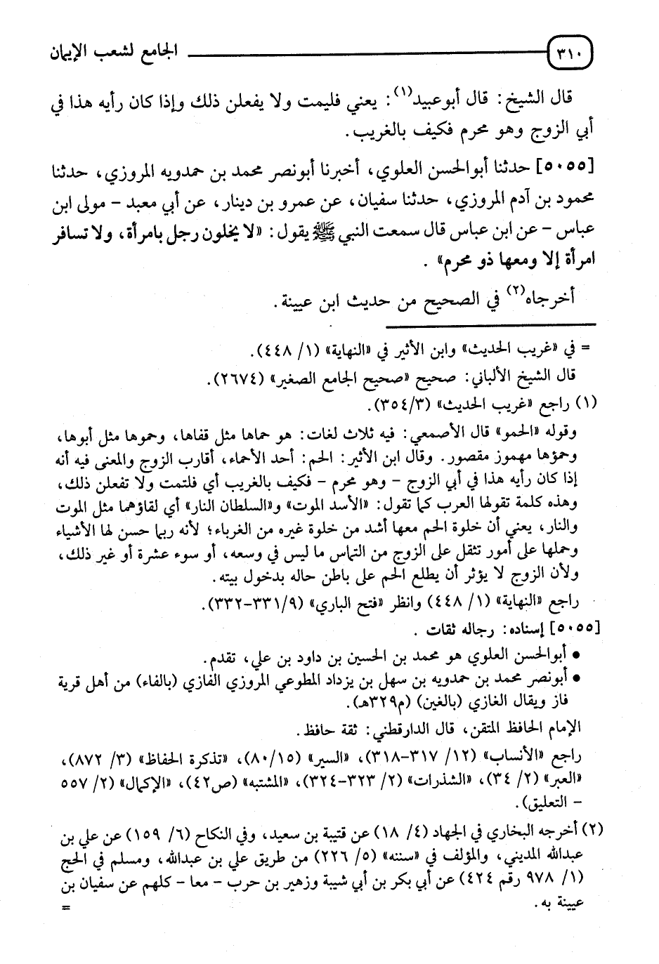 5055 - حَدَّثَنَا أَبُو الْحَسَنِ الْعَلَوِيُّ، أنا أَبُو نَصْرٍ مُحَمَّدُ بْنُ حَمْدَوَيهِ الْمَرْوَزِيُّ، ثنا مَحْمُودُ بْنُ آدَمَ الْمَرْوَزِيُّ، ثنا سُفْيَانُ، عَنْ عَمْرِو بْنِ دِينَارٍ، عَنْ أَبِي مَعْبَدٍ، مَوْلَى ابْنِ عَبَّاسٍ، عَنِ ابْنِ عَبَّاسٍ، قَالَ: سَمِعْتُ النَّبِيَّ صَلَّى اللَّهُ عَلَيْهِ وَسَلَّمَ يَقُولُ: " §لَا يَخْلُوَنَّ رَجُلٌ بِامْرَأَةٍ، وَلَا تُسَافِرُ امْرَأَةٌ إِلَّا وَمَعَهَا ذُو مَحْرَمٍ " أَخْرَجَاهُ فِي الصَّحِيحِ مِنْ حَدِيثِ ابْنِ عُيَيْنَةَ