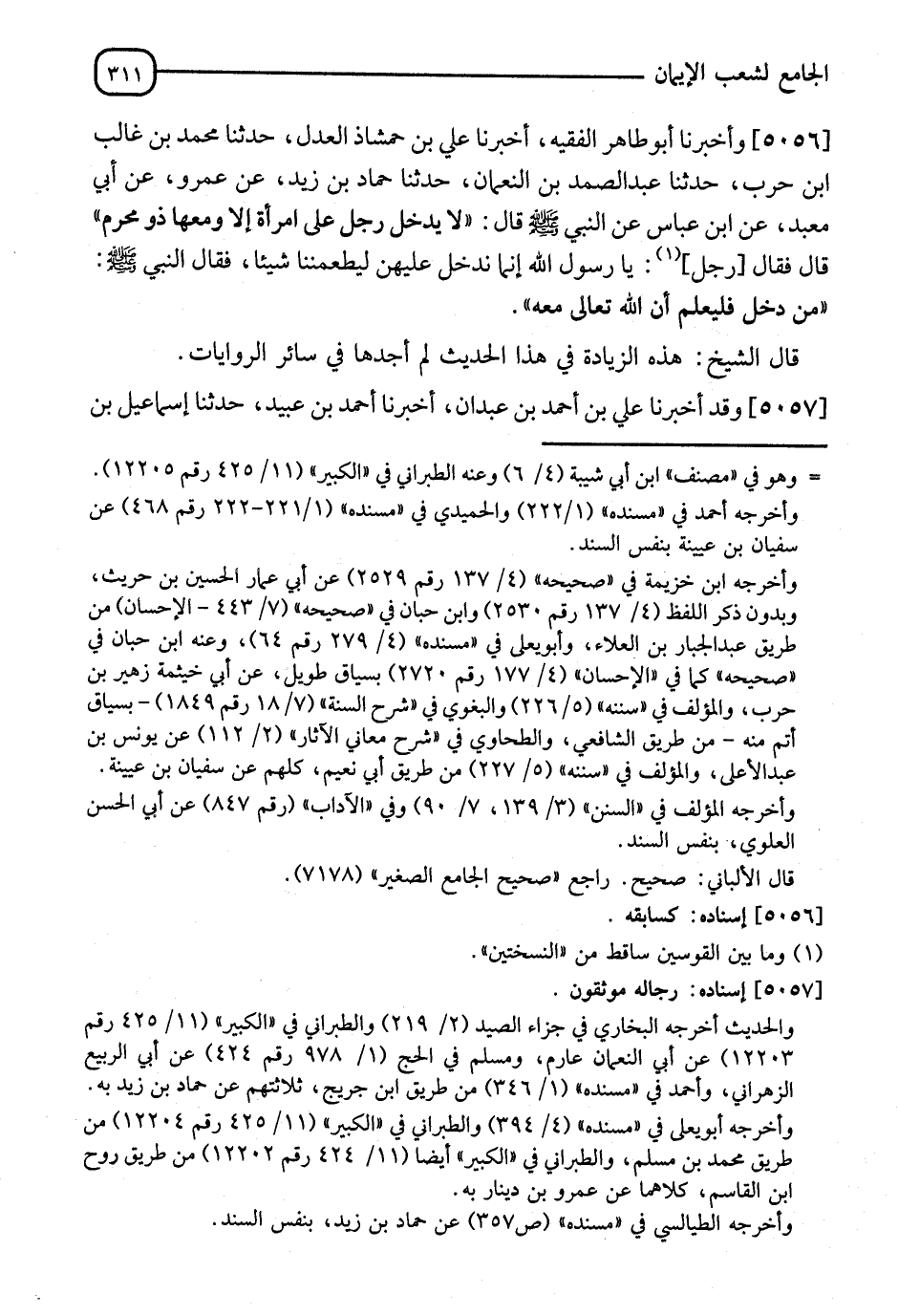 5056 - أَخْبَرَنَا أَبُو طَاهِرٍ الْفَقِيهُ، أنا عَلِيُّ بْنُ حَمْشَاذَ الْعَدْلُ، ثنا مُحَمَّدُ بْنُ غَالِبِ بْنِ حَرْبٍ، ثنا عَبْدُ الصَّمَدِ بْنُ النُّعْمَانِ، ثنا حَمَّادُ بْنُ زَيْدٍ، عَنْ عَمْرٍو، عَنْ أَبِي مَعْبَدٍ، عَنِ ابْنِ عَبَّاسٍ، عَنِ النَّبِيِّ صَلَّى اللَّهُ عَلَيْهِ وَسَلَّمَ قَالَ: §" لَا يَدْخُلْ رَجُلٌ عَلَى امْرَأَةٍ إِلَّا وَمَعَهَا ذُو مَحْرَمٍ " قَالَ: فَقَالَ: يَا رَسُولَ اللهِ، إِنَّمَا نَدْخُلُ عَلَيْهِنَّ لِيُطْعِمْنَنَا شَيْئًا؟ فَقَالَ النَّبِيُّ صَلَّى اللَّهُ عَلَيْهِ وَسَلَّمَ: " مَنْ دَخَلَ فَلْيَعْلَمْ أَنَّ اللهَ تَعَالَى مَعَهُ " قَالَ الشَّيْخُ: " هَذِهِ الزِّيَادَةُ فِي هَذَا الْحَدِيثِ لَمْ أَجِدْهَا فِي سَائِرِ الرِّوَايَاتِ "