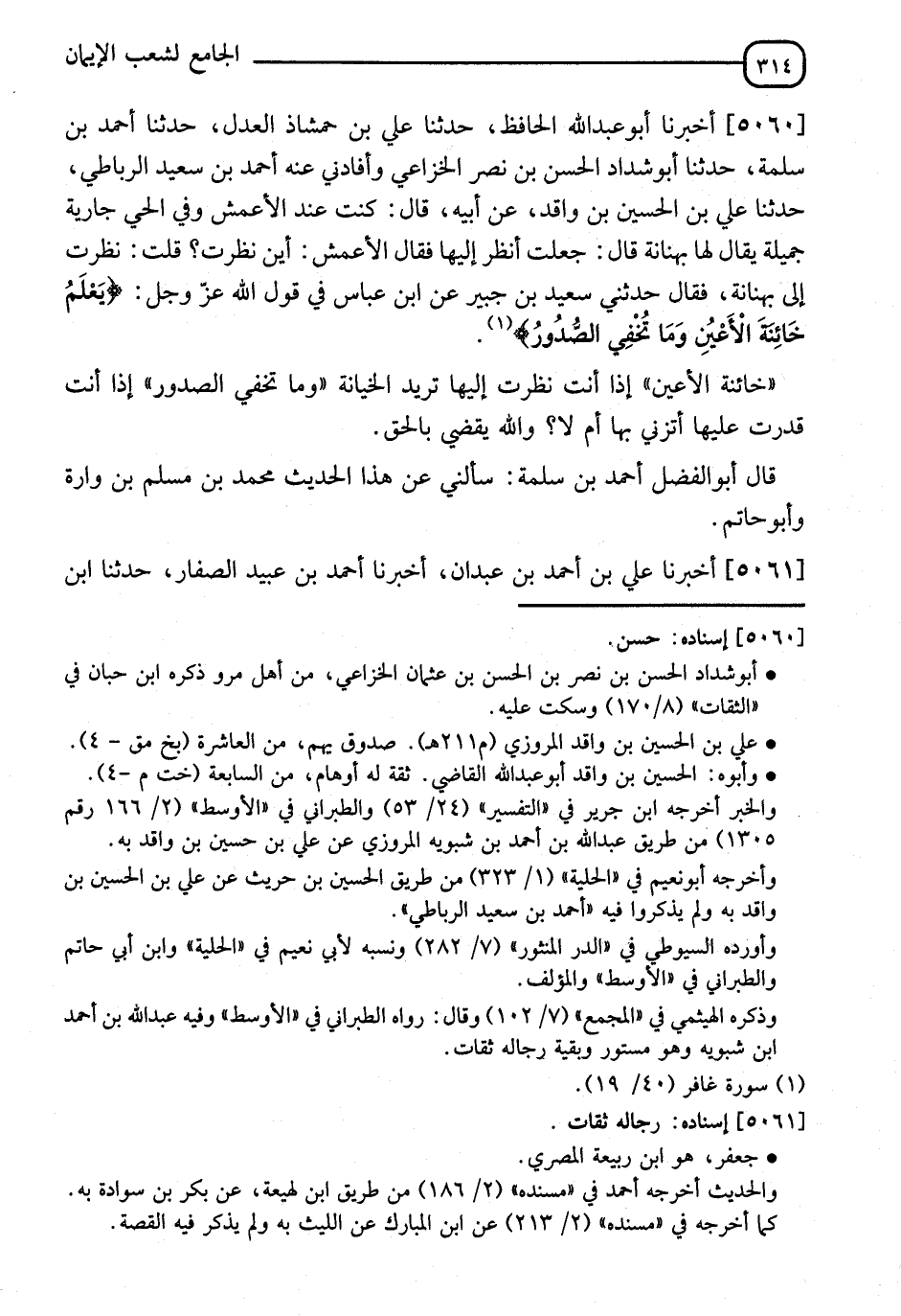 5060 - أَخْبَرَنَا أَبُو عَبْدِ اللهِ الْحَافِظُ، ثنا عَلِيُّ بْنُ حَمْشَاذَ الْعَدْلُ، أنا أَحْمَدُ بْنُ سَلَمَةَ، ثنا أَبُو شَدَّادٍ الْحُسَيْنُ بْنُ نَصْرٍ الْخُزَاعِيُّ، وَأَفَادَنِي عَنْهُ أَحْمَدُ بْنُ سَعِيدٍ الرِّبَاطِيُّ، ثنا عَلِيُّ بْنُ الْحُسَيْنِ بْنِ وَاقِدٍ، عَنْ أَبِيهِ، قَالَ: كُنْتُ عِنْدَ الْأَعْمَشِ وَفِي الْحَيِّ جَارِيَةٌ جَمِيلَةٌ يُقَالُ لَهَا بَهْنَانَةُ، قَالَ: جَعَلْتُ أَنْظُرُ إِلَيْهَا، فَقَالَ الْأَعْمَشُ: أَيْنَ نَظَرْتَ؟ قُلْتُ: نَظَرْتُ إِلَى بَهْنَانَةَ، قَالَ: حَدَّثَنِي سَعِيدُ بْنُ جُبَيْرٍ، عَنِ ابْنِ عَبَّاسٍ فِي قَوْلِ اللهِ عَزَّ وَجَلَّ {§يَعْلَمُ خَائِنَةَ} [غافر: 19] الْأَعْيُنِ وَمَا تُخْفِي الصُّدُورُ " خَائِنَةُ الْأَعْيُنِ إِذَا أَنْتَ نَظَرْتَ إِلَيْهَا تُرِيدُ الْخِيَانَةَ، وَمَا تُخْفِي الصُّدُورُ إِذَا أَنْتَ قَدَرْتَ عَلَيْهَا أَتَزْنِي أَمْ لَا، وَاللهُ يَقْضِي بِالْحَقِّ " قَالَ أَبُو الْفَضْلِ أَحْمَدُ بْنُ سَلَمَةَ: " سَأَلَنِي عَنْ هَذَا الْحَدِيثِ مُحَمَّدُ بْنُ مُسْلِمِ بْنِ دَارَةَ وَأَبُو حَاتِمٍ "