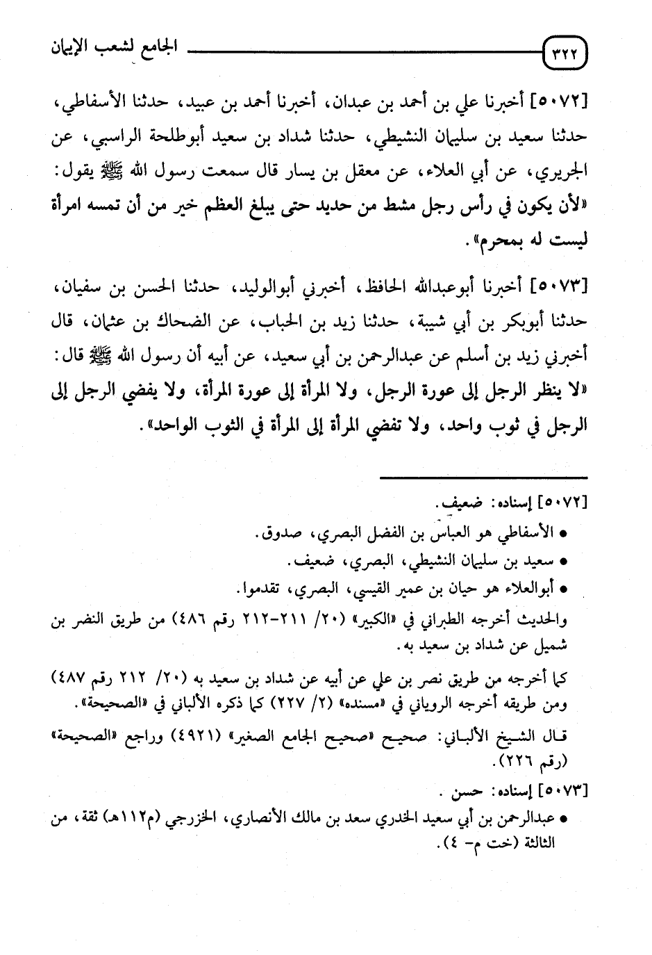 5073 - أَخْبَرَنَا أَبُو عَبْدِ اللهِ الْحَافِظُ، أَخْبَرَنِي أَبُو الْوَلِيدِ، ثنا الْحَسَنُ بْنُ سُفْيَانَ، ثنا أَبُو بَكْرِ بْنُ أَبِي شَيْبَةَ، ثنا زَيْدُ بْنُ الْحُبَابِ، عَنِ الضَّحَّاكِ بْنِ عُثْمَانَ، قَالَ: أَخْبَرَنِي زَيْدُ بْنُ أَسْلَمَ، عَنْ عَبْدِ الرَّحْمَنِ بْنِ أَبِي سَعِيدٍ، عَنْ أَبِيهِ، أَنَّ رَسُولَ اللهِ صَلَّى اللَّهُ عَلَيْهِ وَسَلَّمَ قَالَ: " §لَا يَنْظُرِ الرَّجُلُ إِلَى عَوْرَةِ الرَّجُلِ، وَلَا الْمَرْأَةُ إِلَى عَوْرَةِ الْمَرْأَةِ، وَلَا يُفْضِي الرَّجُلُ إِلَى الرَّجُلِ فِي ثَوْبٍ وَاحِدٍ، وَلَا تُفْضِي الْمَرْأَةُ إِلَى الْمَرْأَةِ فِي الثَّوْبِ الْوَاحِدِ " -[323]- رَوَاهُ مُسْلِمٌ فِي الصَّحِيحِ، عَنْ أَبِي شَيْبَةَ