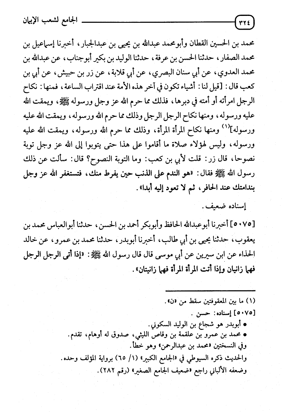 5075 - أَخْبَرَنَا أَبُو عَبْدِ اللهِ الْحَافِظُ، وَأَبُو بَكْرٍ أَحْمَدُ بْنُ الْحَسَنِ، ثنا أَبُو الْعَبَّاسِ مُحَمَّدُ بْنُ يَعْقُوبَ، ثنا يَحْيَى بْنُ أَبِي طَالِبٍ، أنا أَبُو بَدْرٍ، ثنا مُحَمَّدُ بْنُ عَبْدِ الرَّحْمَنِ، عَنْ خَالِدٍ الْحَذَّاءِ، عَنِ ابْنِ سِيرِينَ، عَنْ أَبِي مُوسَى قَالَ: قَالَ رَسُولُ اللهِ صَلَّى اللَّهُ عَلَيْهِ وَسَلَّمَ: " §إِذَا أَتَى الرَّجُلُ الرَّجُلَ فَهُمَا زَانِيَانِ، وَإِذَا أَتَتِ الْمَرْأَةُ الْمَرْأَةَ فَهُمَا زَانِيَانِ "