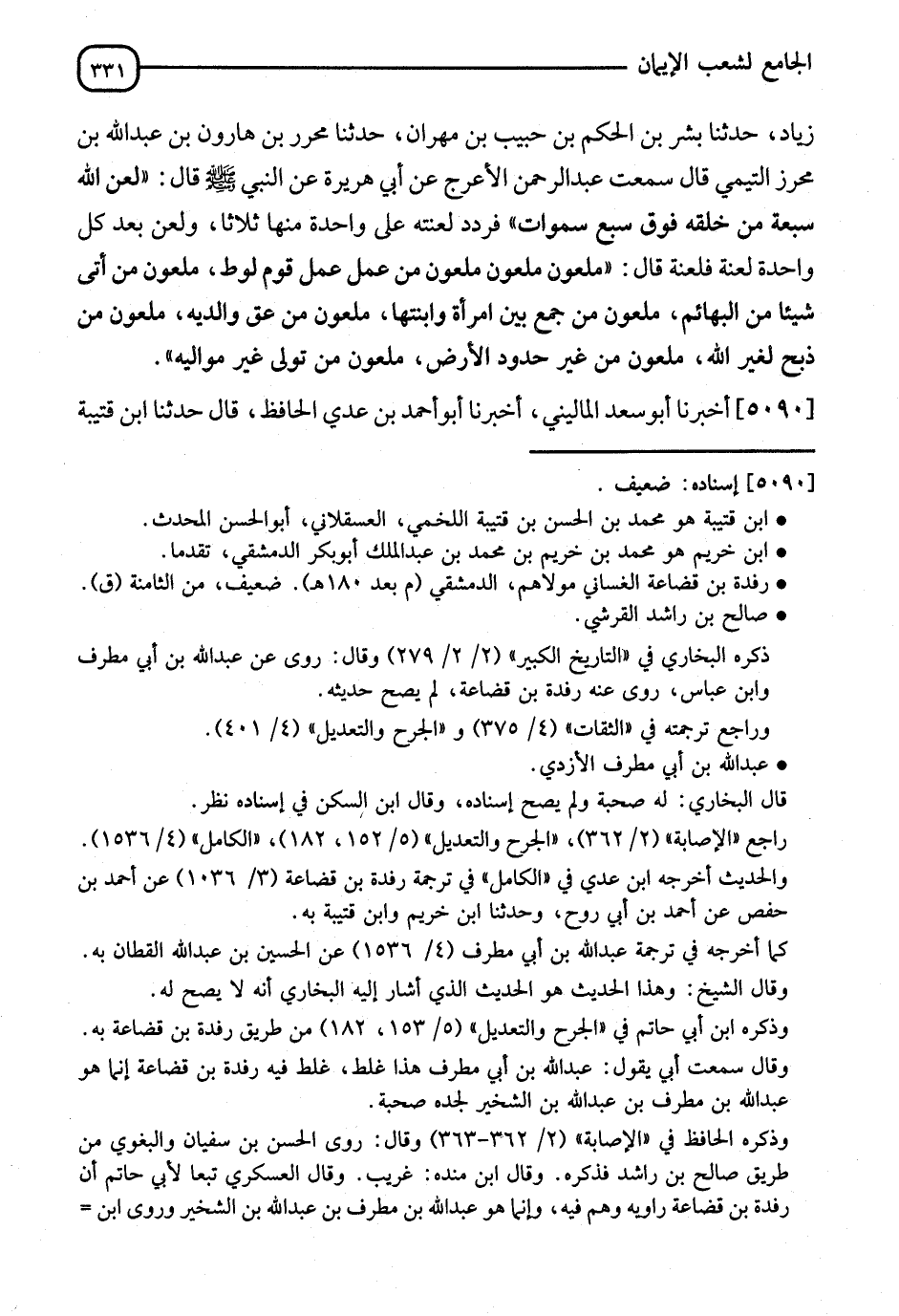 5090 - أَخْبَرَنَا أَبُو سَعْدٍ الْمَالِينِيُّ، أنا أَبُو أَحْمَدَ بْنُ عَدِيٍّ الْحَافِظُ، قَالَ: ثنا ابْنُ قُتَيْبَةَ، -[332]- وَابْنُ خُرَيْمٍ، وَالْحُسَيْنُ بْنُ عَبْدِ اللهِ الْقَطَّانُ قَالُوا: أنا هِشَامُ بْنُ عَمَّارٍ، ثنا رِفْدَةُ بْنُ قُضَاعَةَ، ثنا صَالِحُ بْنُ رَاشِدٍ الْقُرَشِيُّ، قَالَ: أُتِيَ الْحَجَّاجُ بْنُ يُوسُفَ بِرَجُلٍ قَدِ اغْتَصَبَ أُخْتَهُ نَفْسَهَا، فَقَالَ: احْبِسُوهُ وَسَلُوا مَنْ هَا هُنَا مِنْ أَصْحَابِ رَسُولِ اللهِ صَلَّى اللَّهُ عَلَيْهِ وَسَلَّمَ، فَسَأَلُوا عَبْدَ اللهِ بْنَ أَبِي مُطَرِّفٍ فَقَالَ: سَمِعْتُ رَسُولَ اللهِ صَلَّى اللَّهُ عَلَيْهِ وَسَلَّمَ يَقُولُ: " §مَنْ تَخَطَّى الْحُرْمَتَيْنِ الِاثْنَتَيْنِ فَخُطُّوا وَسَطَهُ بِالسَّيْفِ " قَالَ: وَكَتَبُوا إِلَى عَبْدِ اللهِ بْنِ عَبَّاسٍ يَسْأَلُونَهُ عَنْ ذَلِكَ، فَكَتَبَ إِلَيْهِمْ بِمِثْلِ قَوْلِ عَبْدِ اللهِ بْنِ أَبِي مُطَرِّفٍ أَخْبَرَنَا أَبُو سَعْدٍ، ثنا أَبُو أَحْمَدَ، قَالَ: سَمِعْتُ ابْنَ حَمَّادٍ يَقُولُ: قَالَ الْبُخَارِيُّ: " عَبْدُ اللهِ بْنُ أَبِي مُطَرِّفٍ لَهُ صُحْبَةٌ وَلَمْ يَصِحَّ إِسْنَادُهُ "