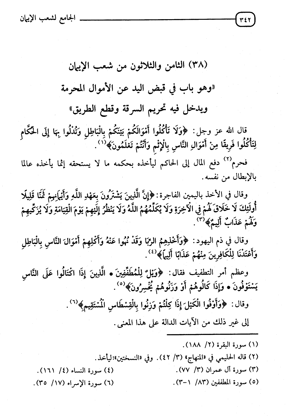 §الثَّامِنُ وَالثَّلَاثُونَ مِنْ شُعَبِ الْإِيمَاِن وَهُوَ بَابٌ فِي قَبْضِ الْيَدِ عَنِ الْأَمْوَالِ الْمُحَرَّمَةِ، وَيَدْخُلُ فِيهِ تَحْرِيمُ السَّرِقَةِ، وَقَطْعُ الطَّرِيقِ قَالَ اللهُ عَزَّ وَجَلَّ: {وَلَا تَأْكُلُوا أَمْوَالَكُمْ بَيْنَكُمْ بِالْبَاطِلِ وَتُدْلُوا بِهَا إِلَى الْحُكَّامِ لِتَأْكُلُوا فَرِيقًا مِنْ أَمْوَالِ النَّاسِ بِالْإِثْمِ وَأَنْتُمْ تَعْلَمُونَ} [البقرة: 188] فَحَرَّمَ دَفْعَ الْمَالِ إِلَى الْحَاكِمِ لِيَأْخُذَ بِحُكْمِهِ مَا لَا يَسْتَحِقُّهُ، إِنَّمَا يَأْخُذْهُ عَالِمًا بِالْإِبْطَالِ مِنْ نَفْسِهِ، وَقَالَ فِي الْأَخْذِ بِالْيَمِينِ الْفَاجِرَةِ: {إِنَّ الَّذِينَ يَشْتَرُونَ بِعَهْدِ اللهِ وَأَيْمَانِهِمْ ثَمَنًا قَلِيلًا أُولَئِكَ لَا خَلَاقَ لَهُمْ فِي الْآخِرَةِ وَلَا يُكَلِّمُهُمُ اللهُ وَلَا يَنْظُرُ إِلَيْهِمْ يَوْمَ الْقِيَامَةِ وَلَا يُزَكِّيهِمْ وَلَهُمْ عَذَابٌ أَلِيمٌ} [آل عمران: 77] وَقَالَ فِي ذَمِّ الْيَهُودِ: {وَأَخْذِهِمُ الرِّبَا وَقَدْ نُهُوا عَنْهُ وَأَكْلِهِمْ أَمْوَالَ النَّاسِ بِالْبَاطِلِ، وَأَعْتَدْنَا لِلْكَافِرِينَ مِنْهُمْ عَذَابًا أَلِيمًا} [النساء: 161] وَعَظَّمَ أَمْرَ التَّطْفِيفِ فَقَالَ: {وَيْلٌ لِلْمُطَفِّفِينَ الَّذِينَ إِذَا اكْتَالُوا عَلَى النَّاسِ يَسْتَوْفُونَ وَإِذَا كَالُوهُمْ أَوْ وَزَنُوهُمْ يُخْسِرُونَ} [المطففين: 2] وَقَالَ: {أَوْفُوا الْكَيْلَ إِذَا كِلْتُمْ وَزِنُوا بِالْقِسْطَاسِ الْمُسْتَقِيمِ} [الإسراء: 35] إِلَى غَيْرِ ذَلِكَ مِنَ الْآيَاتِ الدَّالَّةِ عَلَى هَذَا الْمَعْنَى،