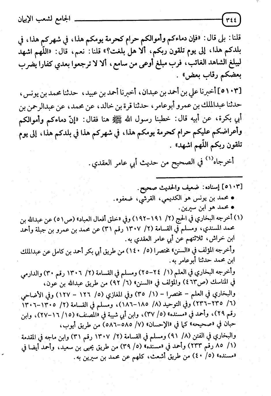 5103 - أَخْبَرَنَا عَلِيُّ بْنُ أَحْمَدَ بْنِ عَبْدِانَ، أنا أَحْمَدُ بْنُ عُبَيْدٍ، ثنا مُحَمَّدُ بْنُ يُونُسَ، ثنا عَبْدُ الْمَلِكِ بْنِ عَمْرٍو أَبُو عَامِرٍ، ثنا قُرَّةُ بْنُ خَالِدٍ، عَنْ مُحَمَّدٍ، عَنْ عَبْدِ الرَّحْمَنِ بْنِ أَبِي بَكْرَةَ، عَنْ أَبِيهِ، قَالَ: خَطَبَنَا رَسُولُ اللهِ صَلَّى اللَّهُ عَلَيْهِ وَسَلَّمَ بِمِنًى فَقَالَ: " إِنَّ §دِمَاءَكُمْ وَأَمْوَالَكُمْ وَأَعْرَاضَكُمْ عَلَيْكُمْ حَرَامٌ، كَحُرْمَةِ يَوْمِكُمْ هَذَا، فِي شَهْرِكُمْ هَذَا، فِي بَلَدِكُمْ هَذَا، إِلَى يَوْمِ تَلْقَوْنَ رَبَّكُمُ، اللهُمَّ اشْهَدْ " أَخْرَجَاهُ فِي الصَّحِيحِ مِنْ حَدِيثِ أَبِي عَامِرٍ الْعَقَدِيِّ
