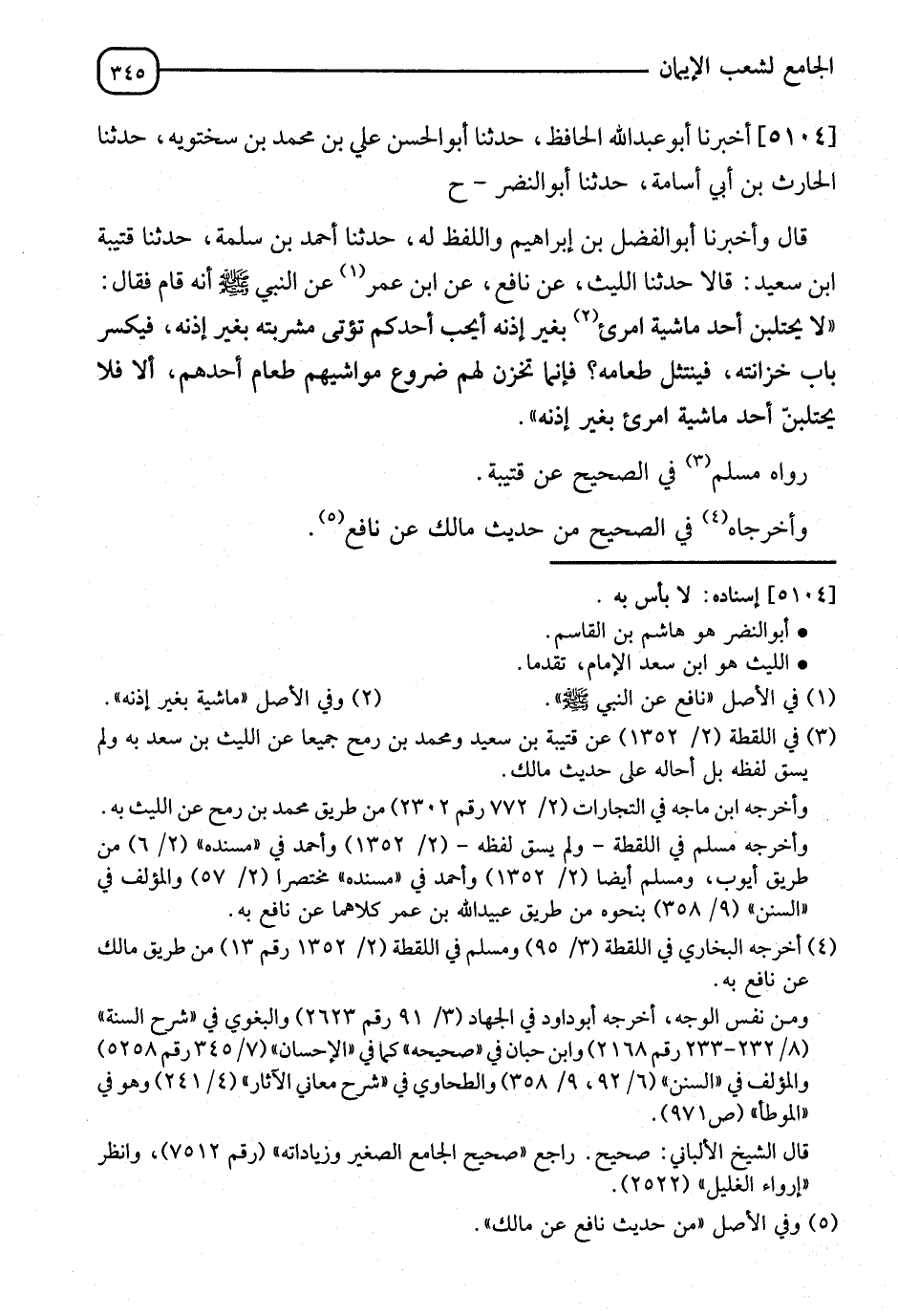 5104 - أَخْبَرَنَا أَبُو عَبْدِ اللهِ الْحَافِظُ، ثنا أَبُو الْحُسَيْنِ عَلِيُّ بْنُ مُحَمَّدِ بْنِ سَخْتَوَيهِ، ثنا الْحَارِثُ بْنُ أَبِي أُسَامَةَ، ثنا أَبُو النَّصْرِ ح، قَالَ: وَأَخْبَرَنَا أَبُو الْفَضْلِ بْنُ إِبْرَاهِيمَ، وَاللَّفْظُ لَهُ، أنا أَحْمَدُ بْنُ سَلَمَةَ، ثنا قُتَيْبَةُ بْنُ سَعِيدٍ، قَالَا: ثنا اللَّيْثُ، عَنْ نَافِعٍ، عَنِ ابْنِ عُمَرَ، عَنِ النَّبِيِّ صَلَّى اللَّهُ عَلَيْهِ وَسَلَّمَ أَنَّهُ قَامَ فَقَالَ: " §لَا يَحْلِبَنَّ أَحَدٌ مَاشِيَةَ امْرِئٍ بِغَيْرِ إِذْنِهِ، أَيُحِبُّ أَحَدُكُمْ أَنْ تُؤْتَى مَشْرَبَتُهُ بِغَيْرِ إِذْنِهِ، فَيُكْسَرَ بَابُ خِزَانَتِهِ، فَيُنْتَثَلَ طَعَامُهُ، فَإِنَّمَا يَخْزِنُ لَهُمْ ضُرُوعُ مَوَاشِيهِمْ طَعَامَ أَحَدِكُمْ، أَلَا فَلَا يَحْتَلِبَنَّ مَاشِيَةَ امْرِئٍ بِغَيْرِ إِذْنِهِ " رَوَاهُ مُسْلِمٌ فِي الصَّحِيحِ، عَنْ قُتَيْبَةَ، وَأَخْرَجَاهُ فِي الصَّحِيحِ مِنْ حَدِيثِ نَافِعٍ، عَنْ مَالِكٍ