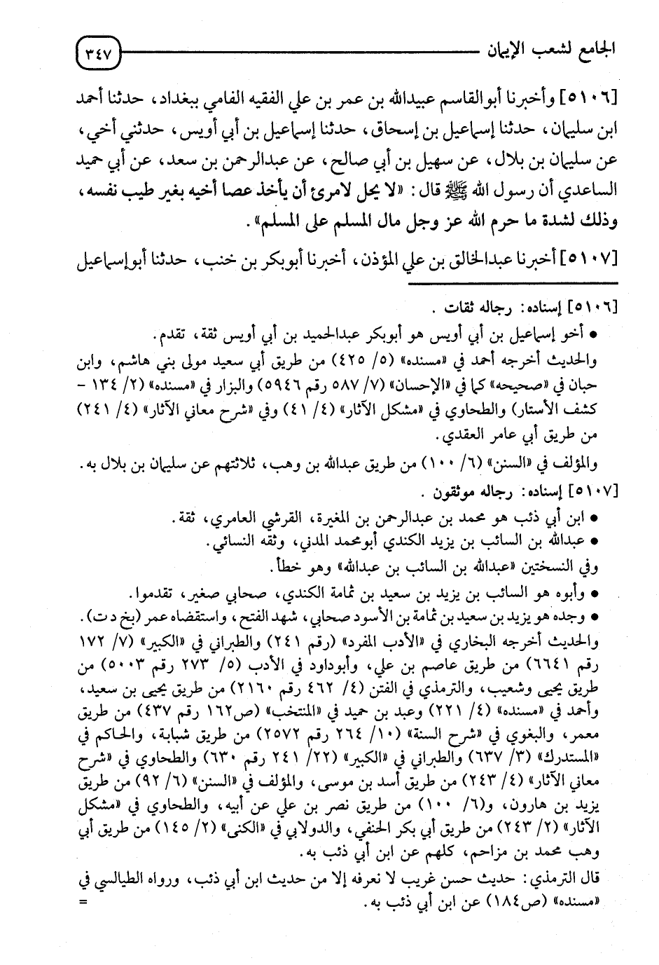 5106 - وَأَخْبَرَنَا أَبُو الْقَاسِمِ عُبَيْدُ اللهِ بْنُ عُمَرَ بْنِ عَلِيٍّ الْفَقِيهُ الْفَامِيُّ، بِبَغْدَادَ، ثنا أَحْمَدُ بْنُ سَلْمَانَ، ثنا إِسْمَاعِيلُ بْنُ إِسْحَاقَ، ثنا إِسْمَاعِيلُ بْنُ أَبِي أُوَيْسٍ، حَدَّثَنِي أَخِي، عَنْ سُلَيْمَانَ بْنِ بِلَالٍ، عَنْ سُهَيْلِ بْنِ أَبِي صَالِحٍ، عَنْ عَبْدِ الرَّحْمَنِ بْنِ سَعْدٍ، عَنْ أَبِي حُمَيْدٍ السَّاعِدِيِّ، أَنَّ رَسُولَ اللهِ صَلَّى اللَّهُ عَلَيْهِ وَسَلَّمَ قَالَ: §" لَا يَحِلُّ لِامْرِئٍ أَنْ يَأْخُذَ عَصَا أَخِيهِ بِغَيْرِ طِيبِ نَفْسِهِ، وَذَلِكَ لِشِدَّةِ مَا حَرَّمَ اللهُ عَزَّ وَجَلَّ مَالَ الْمُسْلِمِ عَلَى الْمُسْلِمِ "