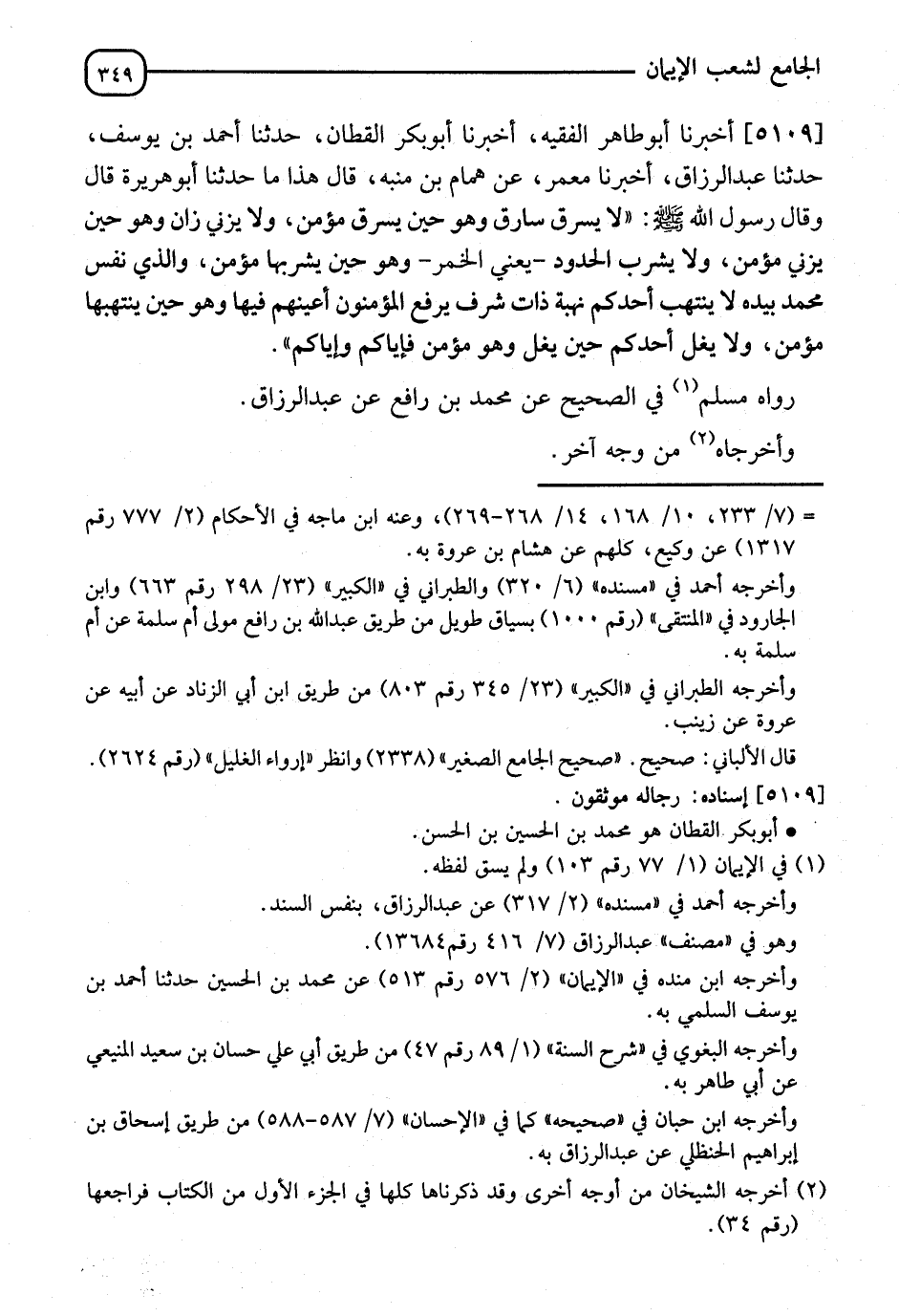5109 - أَخْبَرَنَا أَبُو طَاهِرٍ الْفَقِيهُ، أنا أَبُو بَكْرٍ الْقَطَّانُ، ثنا أَحْمَدُ بْنُ يُوسُفَ، ثنا عَبْدُ الرَّزَّاقِ، أنا مَعْمَرٌ، عَنْ هَمَّامِ بْنِ مُنَبِّهٍ، قَالَ: هَذَا مَا حَدَّثَنَا أَبُو هُرَيْرَةَ قَالَ: وَقَالَ رَسُولُ اللهِ صَلَّى اللَّهُ عَلَيْهِ وَسَلَّمَ: " §لَا يَسْرِقُ سَارِقٌ وَهُوَ حِينَ يَسْرِقُ مُؤْمِنٌ، وَلَا يَزْنِي زَانٍ وَهُوَ حِينَ يَزْنِي مُؤْمِنٌ، وَلَا يَشْرَبُ الْحُدُودَ - يَعْنِي الْخَمْرَ - وَهُوَ حِينَ يَشْرَبُهَا مُؤْمِنٌ، وَالَّذِي نَفْسُ مُحَمَّدٍ بِيَدِهِ، لَا يَنْتَهِبُ أَحَدُكُمْ نُهْبَةً ذَاتَ شَرَفٍ، يَرْفَعُ الْمُؤْمِنُونَ أَعْيُنَهُمْ فِيهَا، وَهُوَ حِينَ يَنْتَهِبُهَا مُؤْمِنٌ، وَلَا يَغُلُّ أَحَدُكُمْ حِينَ يَغُلُّ وَهُوَ مُؤْمِنٌ، فَإِيَّاكُمْ وَإِيَّاكُمْ " رَوَاهُ مُسْلِمٌ فِي الصَّحِيحِ، عَنْ مُحَمَّدِ بْنِ رَافِعٍ، عَنْ عَبْدِ الرَّزَّاقِ، وَأَخْرَجَاهُ مِنْ وَجْهٍ آخَرَ