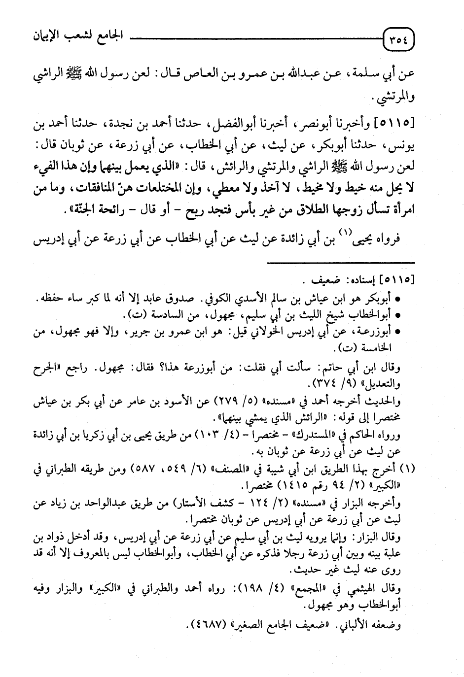 5115 - أَخْبَرَنَا أَبُو نَصْرٍ، ثنا أَبُو الْفَضْلِ، ثنا أَحْمَدُ بْنُ نَجْدَةَ، ثنا أَحْمَدُ بْنُ يُونُسَ، ثنا أَبُو بَكْرٍ، عَنْ لَيْثٍ، عَنْ أَبِي الْخَطَّابِ، عَنْ أَبِي زُرْعَةَ، عَنْ ثَوْبَانَ قَالَ: §لَعَنَ رَسُولُ اللهِ صَلَّى اللَّهُ عَلَيْهِ وَسَلَّمَ الرَّاشِيَ وَالْمُرْتَشِيَ وَالرَّائِشَ، قَالَ: " الَّذِي يَعْمَلُ بَيْنَهُمَا، وَإِنَّ هَذَا الْفَيْءَ لَا يَحِلُّ مِنْهُ خَيْطٌ وَلَا مَخِيطٌ، لَا آخُذَ وَلَا مُعْطِيَ، وَإِنَّ الْمُخْتَلِعَاتِ هُنَّ الْمُنَافِقَاتُ، وَمَا مِنِ امْرَأَةٍ تَسْأَلُ زَوْجَهَا الطَّلَاقَ مِنْ غَيْرِ بَأْسٍ فَتَجِدُ رِيحَ - أَوْ قَالَ: رَائِحَةَ - الْجَنَّةِ " وَرَوَاهُ يَحْيَى بْنُ أَبِي زَائِدَةَ، عَنْ لَيْثٍ، عَنْ أَبِي الْخَطَّابِ، عَنْ أَبِي قَزْعَةَ، عَنْ أَبِي إِدْرِيسَ، -[355]- عَنْ ثَوْبَانَ، وَرَوَاهُ الْمُعْتَمِرُ بْنُ سُلَيْمَانَ، عَنْ لَيْثٍ، عَنْ أَبِي إِدْرِيسَ، عَنْ ثَوْبَانَ فِي الرَّاشِي وَالْمُرْتَشِي وَالرَّائِشِ