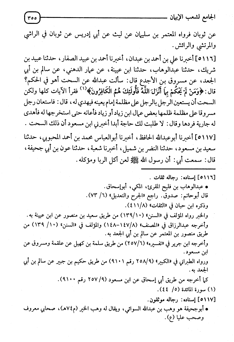 5116 - أَخْبَرَنَا عَلِيُّ بْنُ أَحْمَدَ بْنِ عَبْدِانَ، أنا أَحْمَدُ بْنُ عُبَيْدٍ الصَّفَّارُ، ثنا عُبَيْدُ بْنُ شَرِيكٍ، ثنا عَبْدُ الْوَهَّابِ، ثنا ابْنُ عُيَيْنَةَ، عَنْ عَمَّارٍ الدُّهْنِيِّ، عَنْ سَالِمِ بْنِ أَبِي الْجَعْدِ، عَنْ مَسْرُوقِ بْنِ الْأَجْدَعِ قَالَ: سَأَلْتُ عَبْدَ اللهِ، عَنِ السُّحْتِ أَهُوَ فِي الْحُكْمِ؟ قَالَ: " {§وَمَنْ لَمْ يَحْكُمْ بِمَا أَنْزَلَ اللهُ فَأُولَئِكَ هُمُ الْكَافِرُونَ} [المائدة: 44] فَقَرَأَ الْآيَاتِ كُلَّهَا، وَلَكِنَّ السُّحْتَ أَنْ يَسْتَعِينَ الرَّجُلُ بِرَجُلٍ عَلَى مَظْلَمَةِ إِمَامٍ فَيُهْدِي لَهُ، قَالَ: فَاسْتَعَانَ رَجُلٌ مَسْرُوقًا عَلَى مَظْلَمَةٍ ظَلَمَهَا بَعْضَ عُمَّالٍ لِابْنِ زِيَادٍ أَوْ زِيَادٍ، فَأَعَانَهُ حَتَّى اسْتَخْرَجَهَا لَهُ، فَأَهْدَى لَهُ جَارِيَةً فَرَدَّهَا وَقَالَ: لَا طُلِبَتْ لَكَ حَاجَةٌ أَبَدًا " أَخْبَرَنِي ابْنُ مَسْعُودٍ أَنَّ ذَلِكَ السُّحْتُ