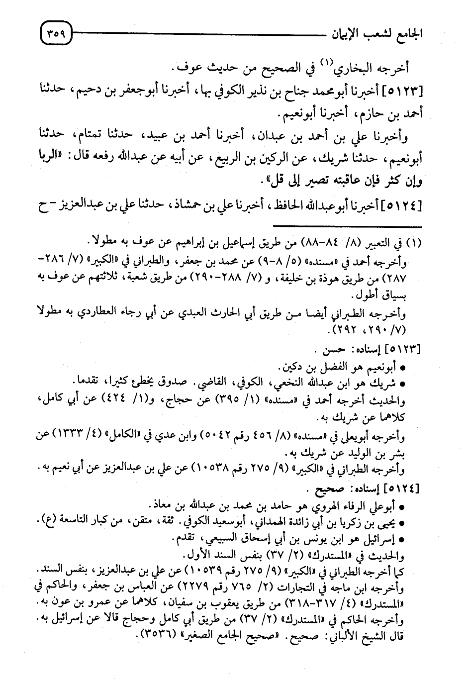 5123 - أَخْبَرَنَا أَبُو مُحَمَّدٍ جَنَاحُ بْنُ نَذِيرٍ الْكُوفِيُّ بِهَا، أنا أَبُو جَعْفَرِ بْنُ دُحَيْمٍ، ثنا أَحْمَدُ بْنُ حَازِمٍ، أنا أَبُو نُعَيْمٍ، وَأَخْبَرَنَا عَلِيُّ بْنُ أَحْمَدَ بْنِ عَبْدِانَ، ثنا أَحْمَدُ بْنُ عُبَيْدٍ، ثنا تَمْتَامٌ، ثنا أَبُو نُعَيْمٍ، ثنا شَرِيكٌ، عَنِ الرُّكَيْنِ بْنِ الرَّبِيعِ، عَنْ أَبِيهِ، عَنْ عَبْدِ اللهِ رَفَعَهُ قَالَ: " §الرِّبَا وَإِنْ كَثُرَ، فَإِنَّ عَاقِبَتَهُ يَصِيرُ إِلَى قُلٍّ "
