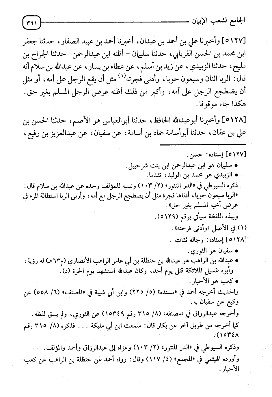 5127 - وَأَخْبَرَنَا عَلِيُّ بْنُ أَحْمَدَ بْنِ عَبْدِانَ، أنا أَحْمَدُ بْنُ عُبَيْدٍ الصَّفَّارُ، ثنا جَعْفَرُ بْنُ مُحَمَّدِ بْنِ الْحَسَنِ الْفِرْيَابِيُّ، ثنا سُلَيْمَانُ، أَظُنُّهُ ابْنَ عَبْدِ الرَّحْمَنِ، ثنا الْجَرَّاحُ بْنُ مَلِيحٍ، ثنا الزُّبَيْدِيُّ، عَنْ زَيْدِ بْنِ أَسْلَمَ، عَنْ عَطَاءِ بْنِ يَسَارٍ، عَنْ عَبْدِ اللهِ بْنِ سَلَامٍ، أَنَّهُ قَالَ: §" الرِّبَا اثْنَانِ وَسَبْعُونَ حُوبًا، وَأَدْنَى فُجْرٍ مِثْلُ أَنْ يَقَعَ الرَّجُلُ عَلَى أُمِّهِ، أَوْ مِثْلُ أَنْ يَضْطَجِعَ الرَّجُلُ عَلَى أُمِّهِ، وَأَكْثَرُ مِنْ ذَلِكَ أَظُنُّ عِرْضُ الرَّجُلِ الْمُسْلِمِ بِغَيْرِ حَقٍّ " " هَكَذَا جَاءَ مَوْقُوفًا "