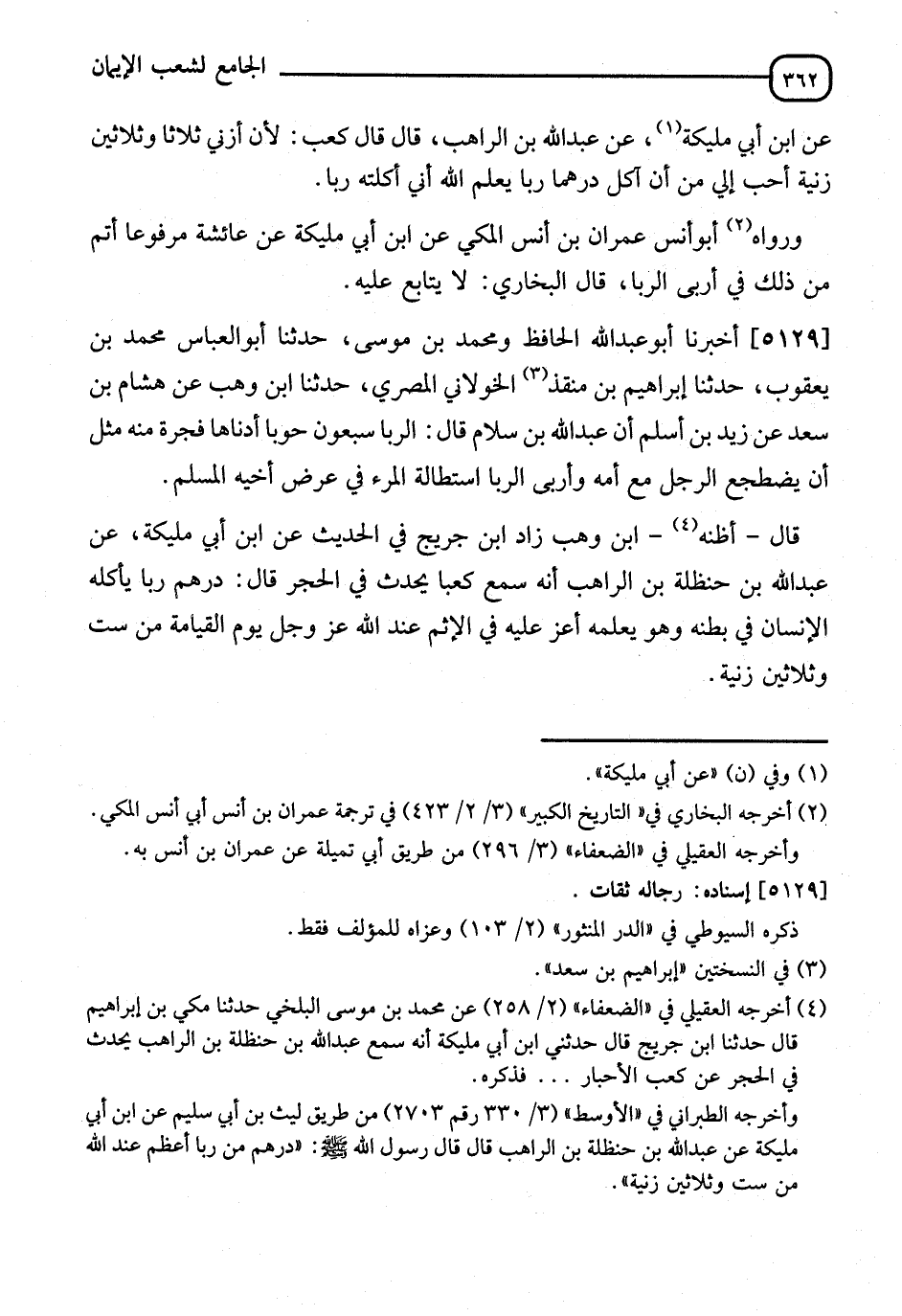 عَنِ ابْنِ أَبِي مُلَيْكَةَ، عَنْ عَبْدِ اللهِ بْنِ حَنْظَلَةَ بْنِ الرَّاهِبِ، أَنَّهُ سَمِعَ كَعْبًا يُحَدِّثُ فِي الْحَجَرِ قَالَ: §" دِرْهَمُ رَبًّا يَأْكُلُهُ أَحَدُ النَّاسِ فِي بَطْنِهِ وَهُوَ يُعْلِمُهُ أَعَزُّ عَلَيْهِ فِي الْإِثْمِ عِنْدَ اللهِ عَزَّ وَجَلَّ يَوْمَ الْقِيَامَةِ مِنْ سِتٍّ وَثَلَاثِينَ زَنْيَةً "