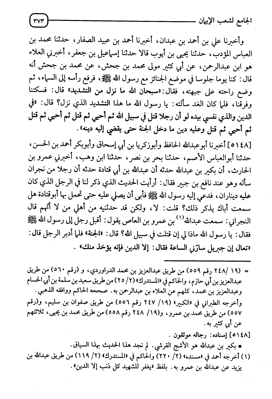 5148 - أَخْبَرَنَا أَبُو عَبْدِ اللهِ الْحَافِظُ، وَأَبُو زَكَرِيَّا بْنُ أَبِي إِسْحَاقَ، وَأَبُو بَكْرٍ أَحْمَدُ بْنُ الْحُسَيْنِ، ثنا أَبُو الْعَبَّاسِ الْأَصَمُّ، ثنا يَحْيَى بْنُ نَصْرٍ، ثنا ابْنُ وَهْبٍ، أَخْبَرَنِي عَمْرُو بْنُ الْحَارِثِ، أَنَّ بُكَيْرَ بْنَ عَبْدِ اللهِ، حَدَّثَهُ، أَنَّ عَبْدَ اللهِ بْنَ أَبِي قَتَادَةَ حَدَّثَهُ، أَنَّ رَجُلًا مِنْ نَجْرَانَ سَأَلَهُ وَهُوَ عِنْدَ نَافِعِ بْنِ جُبَيْرٍ فَقَالَ: أَرَأَيْتَ الْحَدِيثَ الَّذِي ذُكِرَ لَنَا، فِي الرَّجُلِ الَّذِي كَانَ عَلَيْهِ دِينَارَانِ، فَدُعِيَ إِلَيْهِ رَسُولُ اللهِ صَلَّى اللَّهُ عَلَيْهِ وَسَلَّمَ فَأَبَى أَنْ يُصَلِّيَ عَلَيْهِ حَتَّى تَحَمَّلَ بِهِمَا أَبُو قَتَادَةَ، هَلْ سَمِعْتَ أَبَاكَ يَذْكُرُ ذَلِكَ؟ قُلْتُ: لَا، وَلَكِنْ قَدْ حَدَّثَنِيهِ مِنْ أَهْلِي مَنْ لَا أَتُّهِمُ، قَالَ النَّجْرَانِيُّ: سَمِعْتُ عَبْدَ اللهِ بْنَ عَمْرِو بْنِ الْعَاصِ يَقُولُ: أَقْبَلَ رَجُلٌ إِلَى رَسُولِ اللهِ صَلَّى اللَّهُ عَلَيْهِ وَسَلَّمَ فَقَالَ: يَا رَسُولَ اللهِ، مَاذَا لِي §إِنْ قُتِلْتُ فِي سَبِيلِ اللهِ؟ قَالَ: " الْجَنَّةُ " فَلَمَّا أَدْبَرَ الرَّجُلُ قَالَ، فَقَالَ: " إِنَّ جِبْرِيلَ سَأَلَنِي السَّاعَةَ " فَقَالَ: " إِلَّا الدَّيْنُ فَإِنَّهُ يُؤْخَذُ مِنْكَ "