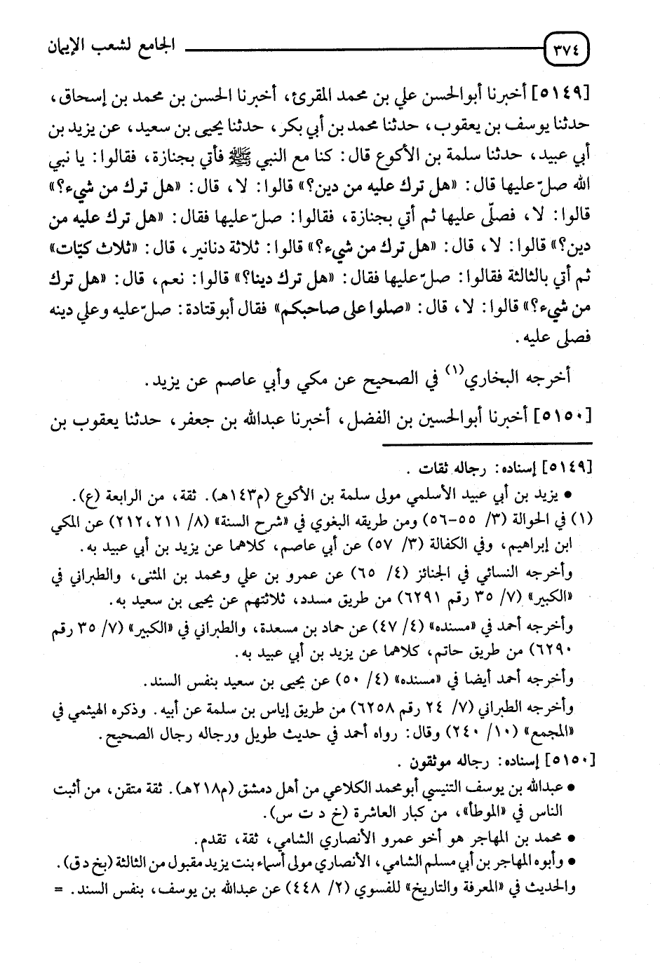 5149 - أَخْبَرَنَا أَبُو الْحَسَنِ عَلِيُّ بْنُ مُحَمَّدٍ الْمُقْرِئُ، أنا الْحَسَنُ بْنُ مُحَمَّدِ بْنِ إِسْحَاقَ، ثنا يُوسُفُ بْنُ يَعْقُوبَ، ثنا مُحَمَّدُ بْنُ أَبِي بَكْرٍ، ثنا يَحْيَى بْنُ سَعِيدٍ، عَنْ يَزِيدَ بْنِ أَبِي عُبَيْدٍ، ثنا سَلَمَةُ بْنُ الْأَكْوَعِ، قَالَ: كُنَّا مَعَ النَّبِيِّ صَلَّى اللَّهُ عَلَيْهِ وَسَلَّمَ، فَأُتِيَ بِجَنَازَةٍ فَقَالُوا: يَا نَبِيَّ اللهِ، صَلِّ عَلَيْهَا، قَالَ: " §هَلْ تَرَكَ عَلَيْهِ مِنْ دَيْنٍ؟ " قَالُوا: لَا، قَالَ: " هَلْ تَرَكَ مِنْ شَيْءٍ؟ " قَالُوا: لَا، فَصَلَّى عَلَيْهَا، ثُمَّ أُتِيَ بِجَنَازَةٍ، فَقَالُوا: صَلِّ عَلَيْهَا، فَقَالَ: " هَلْ تَرَكَ عَلَيْهِ مِنْ دَيْنٍ؟ " قَالُوا: لَا، قَالَ: " هَلْ تَرَكَ مِنْ شَيْءٍ؟ " قَالُوا: ثَلَاثَةَ دَنَانِيرَ، قَالَ: " ثَلَاثُ كَيَّاتٍ " ثُمَّ أُتِيَ بِالثَّالِثَةِ فَقَالُوا: صَلِّ عَلَيْهَا، فَقَالَ: " هَلْ تَرَكَ دَيْنًا؟ " قَالُوا: نَعَمْ، قَالَ: " هَلْ تَرَكَ مِنْ شَيْءٍ؟ " قَالُوا: لَا، قَالَ: " صَلُّوا عَلَى صَاحِبِكُمْ " فَقَالَ أَبُو قَتَادَةَ: صَلِّ عَلَيْهِ وَعَلَيَّ دَيْنُهُ، فَصَلَّى عَلَيْهِ أَخْرَجَهُ الْبُخَارِيُّ فِي الصَّحِيحِ، عَنْ عَلِيٍّ وَأَبِي عَاصِمٍ، عَنْ يَزِيدَ