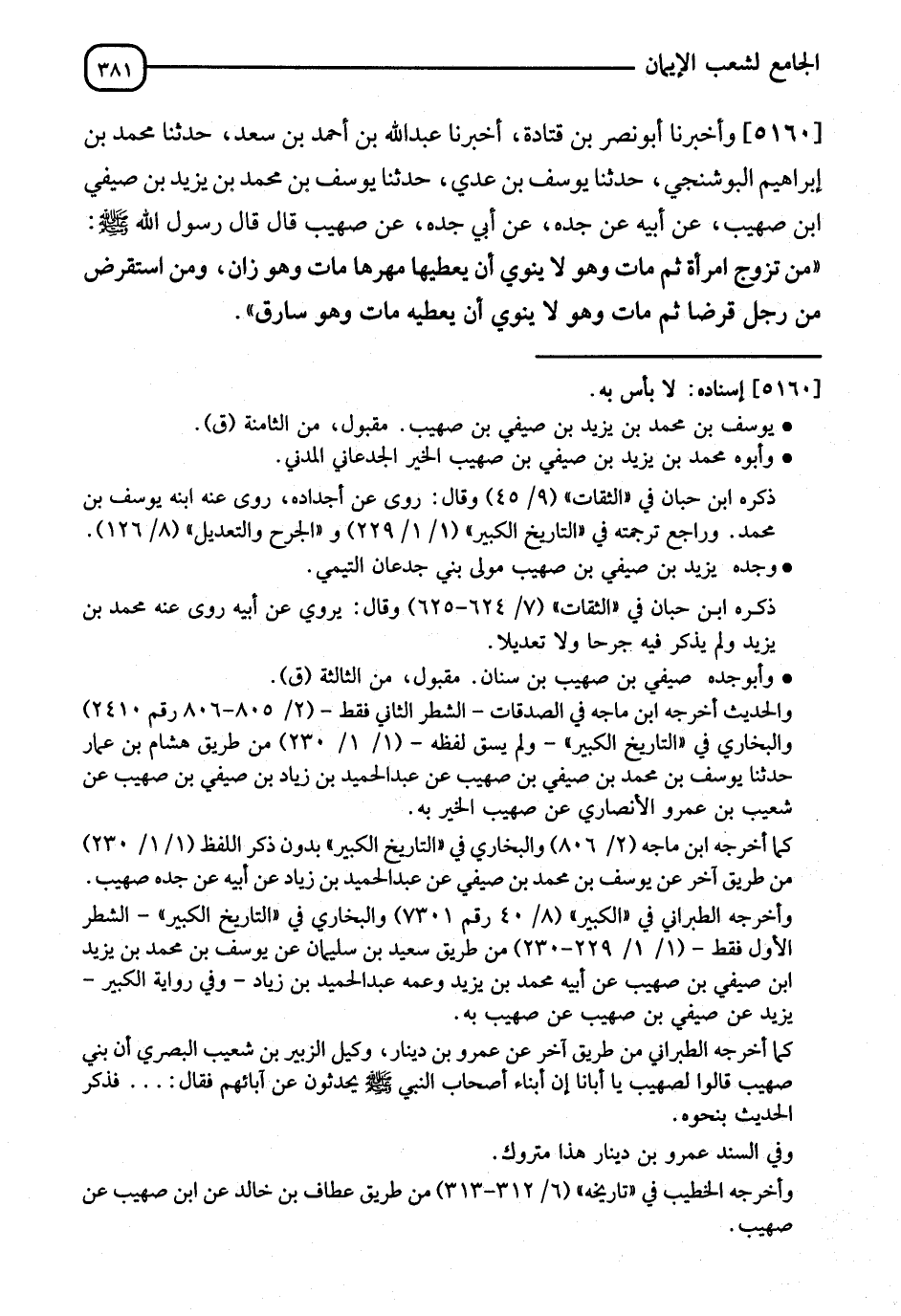 5160 - وَأَخْبَرَنَا أَبُو نَصْرِ بْنُ قَتَادَةَ، أنا عَبْدُ اللهِ بْنُ أَحْمَدَ بْنِ سَعْدٍ، ثنا مُحَمَّدُ بْنُ إِبْرَاهِيمَ الْبُوشَنْجِيُّ، ثنا يُوسُفُ بْنُ عَدِيٍّ، ثنا يُوسُفُ بْنُ مُحَمَّدِ بْنِ يَزِيدَ بْنِ صَيْفِيِّ بْنِ صُهَيْبٍ، عَنْ أَبِيهِ، عَنْ جَدِّهِ، عَنْ أَبِي جَدِّهِ، عَنْ صُهَيْبٍ قَالَ: قَالَ رَسُولُ اللهِ صَلَّى اللَّهُ عَلَيْهِ وَسَلَّمَ: " §مَنْ تَزَوَّجَ امْرَأَةً، ثُمَّ مَاتَ وَهُوَ لَا يَنْوِي أَنْ يُعْطِيَهَا مَهْرَهَا مَاتَ وَهُوَ زَانٍ، وَمَنِ اسْتَقْرَضَ مِنْ رَجُلٍ قَرْضًا، ثُمَّ مَاتَ وَهُوَ لَا يَنْوِي أَنْ يُعْطِيَهُ مَاتَ وَهُوَ سَارِقٌ "