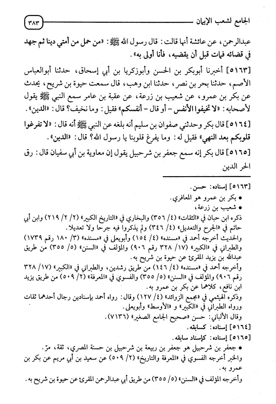 5163 - أَخْبَرَنَا أَبُو بَكْرِ بْنُ الْحَسَنِ، وَأَبُو زَكَرِيَّا بْنُ أَبِي إِسْحَاقَ، ثنا أَبُو الْعَبَّاسِ الْأَصَمُّ، ثنا بَحْرُ بْنُ نَصْرٍ، ثنا ابْنُ وَهْبٍ، قَالَ: سَمِعْتُ حَيْوَةَ بْنَ شُرَيْحٍ يُحَدِّثُ، عَنْ بَكْرِ بْنِ عَمْرٍو عَنْ شُعَيْبِ بْنِ زُرْعَةَ، عَنْ عُقْبَةَ بْنِ عَامِرٍ، سَمِعَ النَّبِيَّ صَلَّى اللَّهُ عَلَيْهِ وَسَلَّمَ يَقُولُ لِأَصْحَابِهِ: " §لَا تَخْنُقُوا الْأَنْفُسَ أَوْ قَالَ: أَنْفُسَكُمْ " فَقِيلَ: وَمَا نَخْنُقُ؟ قَالَ: " الدَّيْنُ "