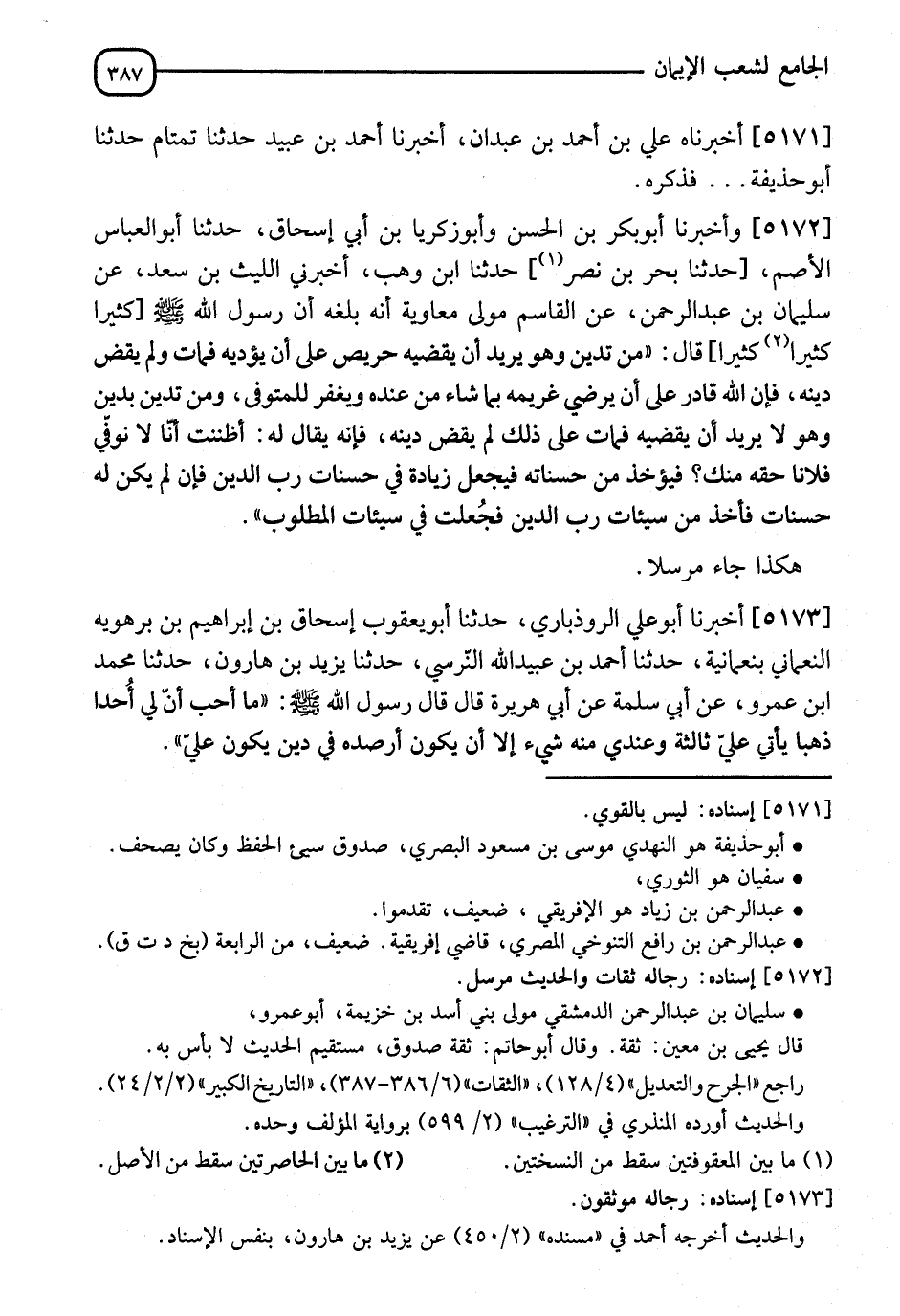 5172 - وَأَخْبَرَنَا أَبُو بَكْرِ بْنُ الْحَسَنِ، وَأَبُو زَكَرِيَّا بْنُ أَبِي إِسْحَاقَ، ثنا أَبُو الْعَبَّاسِ الْأَصَمُّ، ثنا ابْنُ وَهْبٍ، أَخْبَرَنِي اللَّيْثُ بْنُ سَعْدٍ، عَنْ سُلَيْمَانَ بْنِ عَبْدِ الرَّحْمَنِ، عَنِ الْقَاسِمِ، مَوْلَى مُعَاوِيَةَ، أَنَّهُ بَلَغَهُ أَنَّ رَسُولَ اللهِ صَلَّى اللَّهُ عَلَيْهِ وَسَلَّمَ كَثِيرًا كَثِيرًا كَثِيرًا قَالَ: " §مَنْ تَدَيَّنَ وَهُوَ يُرِيدُ أَنْ يَقْضِيَهُ، حَرِيصٌ عَلَى أَنْ يُؤَدِّيَهُ، مَاتَ وَلَمْ يَقْضِ دَيْنَهُ، فَإِنَّ اللهَ قَادِرٌ عَلَى أَنْ يُرْضِيَ غَرِيمَهُ بِمَا شَاءَ مِنْ عِنْدِهِ، وَيَغْفِرُ لِلْمُتَوَفَّى، وَمَنْ تَدَيَّنَ بِدَيْنٍ وَهُوَ لَا يُرِيدُ أَنْ يَقْضِيَهُ فَمَاتَ عَلَى ذَلِكَ لَمْ يُقْضَ دِينُهُ، فَإِنَّهُ يُقَالُ لَهُ: ظَنَنْتَ أَنَّا لَا نُوَفِّي فُلَانًا حَقَّهُ مِنْكَ، فَيُؤْخَذُ مِنْ حَسَنَاتِهِ فَتُجْعَلُ زِيَادَةً فِي حَسَنَاتِ رَبِّ الدَّيْنِ، فَإِنْ لَمْ يَكُنْ لَهُ حَسَنَاتٌ أَخَذَ مِنْ سَيِّئَاتِ رَبِّ الدَّيْنِ فَجُعِلَتْ فِي سَيِّئَاتِ الْمَطْلُوبِ " هَكَذَا جَاءَ مُرْسَلًا