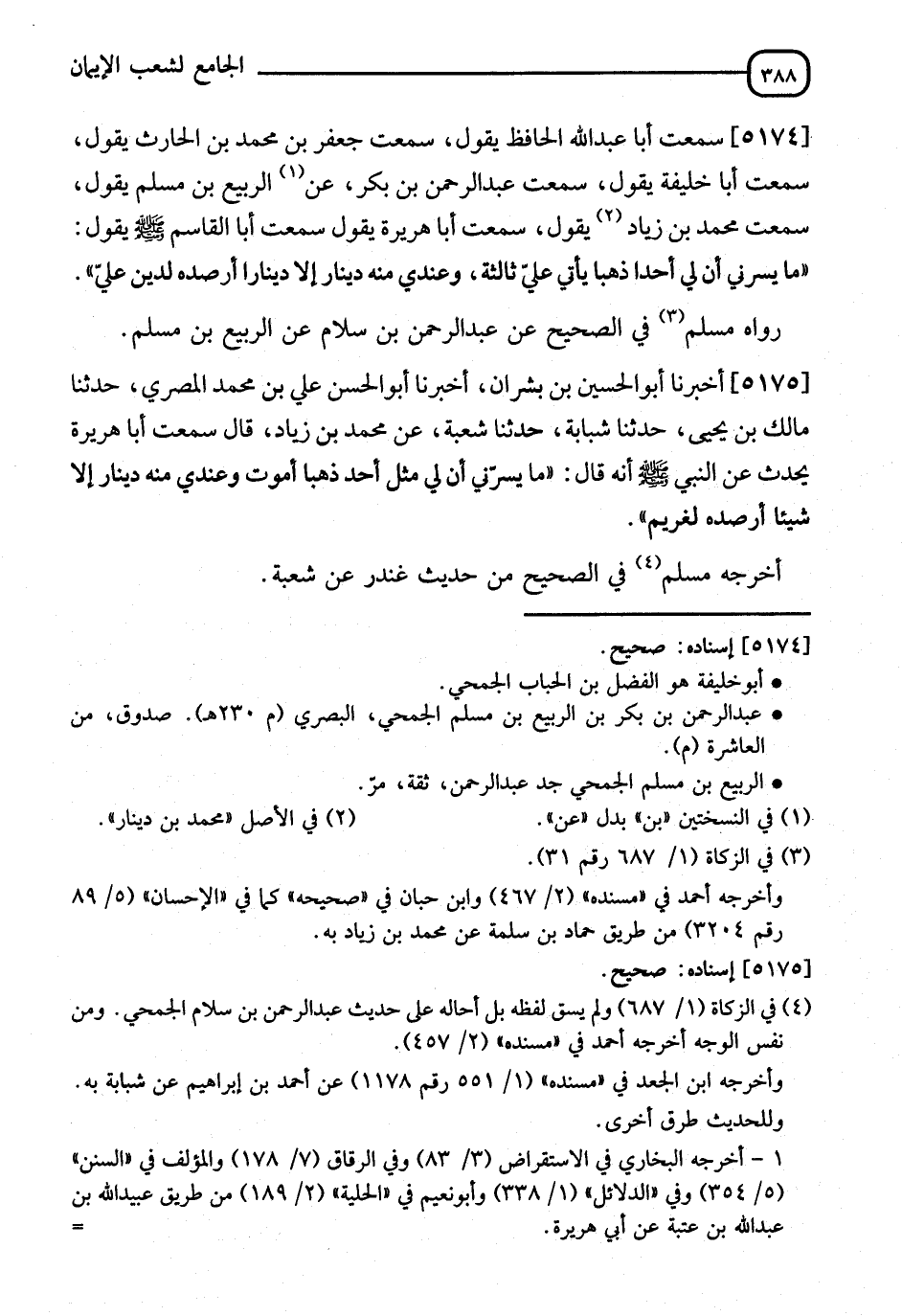 5174 - سَمِعْتُ أَبَا عَبْدِ اللهِ الْحَافِظُ، يَقُولُ: سَمِعْتُ جَعْفَرَ بْنَ مُحَمَّدِ بْنِ الْحَارِثِ، يَقُولُ: سَمِعْتُ أَبَا خَلِيفَةَ، يَقُولُ: سَمِعْتُ عَبْدَ الرَّحْمَنِ بْنَ بَكْرٍ، عَنِ الرَّبِيعِ بْنِ مُسْلِمٍ، يَقُولُ: سَمِعْتُ مُحَمَّدَ بْنَ زِيَادٍ، يَقُولُ: سَمِعْتُ أَبَا هُرَيْرَةَ يَقُولُ: سَمِعْتُ أَبَا الْقَاسِمِ صَلَّى اللَّهُ عَلَيْهِ وَسَلَّمَ يَقُولُ: " §مَا يَسُرُّنِي أَنَّ لِي أُحُدًا ذَهَبًا، يَأْتِي عَلَيَّ ثَلَاثَةٌ وَعِنْدِي مِنْهُ دِينَارٌ إِلَّا دِينَارًا أُرْصِدُهُ لِدَيْنٍ عَلَيَّ " رَوَاهُ مُسْلِمٌ فِي الصَّحِيحِ، عَنْ عَبْدِ الرَّحْمَنِ بْنِ سَلَامٍ، عَنِ الرَّبِيعِ بْنِ مُسْلِمٍ