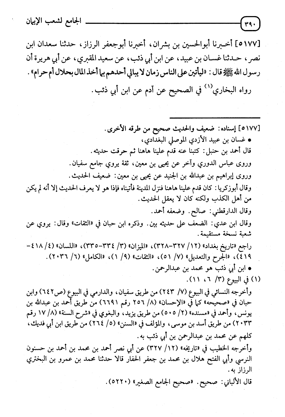 5177 - أَخْبَرَنَا أَبُو الْحُسَيْنِ بْنُ بِشْرَانَ، أنا أَبُو جَعْفَرٍ الرَّزَّازُ، ثنا سَعْدَانُ بْنُ نَصْرٍ، ثنا غَسَّانُ بْنُ عُبَيْدٍ، عَنِ ابْنِ أَبِي ذِئْبٍ، عَنْ سَعِيدٍ الْمَقْبُرِيِّ، عَنْ أَبِي هُرَيْرَةَ، أَنَّ رَسُولَ اللهِ صَلَّى اللَّهُ عَلَيْهِ وَسَلَّمَ قَالَ: §" لَيَأْتِيَنَّ عَلَى النَّاسِ زَمَانٌ لَا يُبَالِي أَحَدُهُمْ بِمَا أَخَذَ مِنَ الْمَالِ بِحَلَالٍ أَمْ بِحَرَامٍ " رَوَاهُ الْبُخَارِيُّ فِي الصَّحِيحِ، عَنْ آدَمَ، عَنِ ابْنِ أَبِي ذِئْبٍ