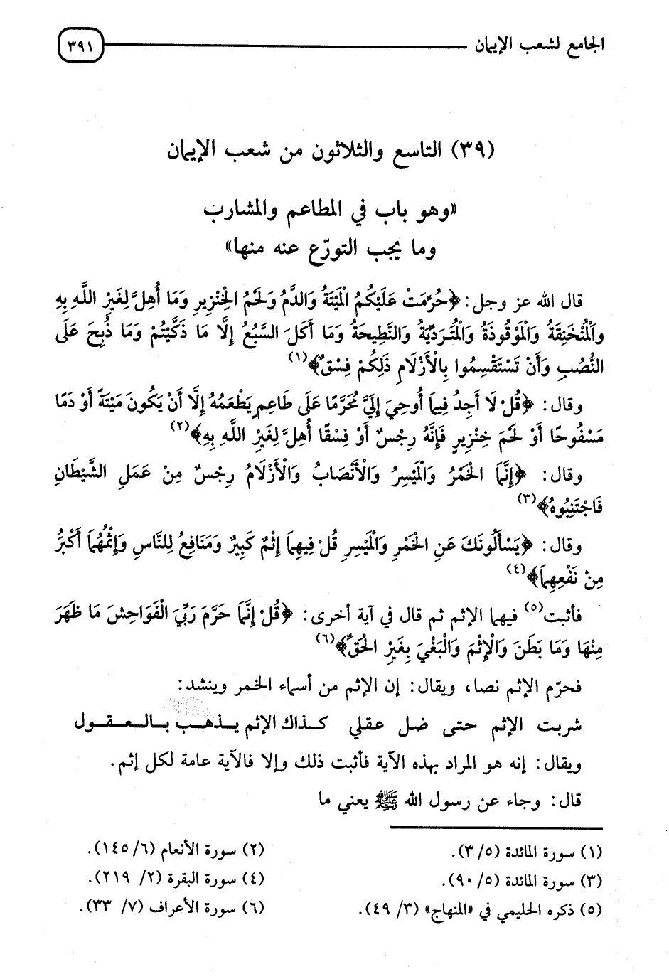 §وَهُوَ بَابٌ فِي الْمَطَاعِمِ والْمشاربِ وَمَا يَجِبُ التَّوَرُّعُ عَنْهُ مِنْهَا قَالَ اللهُ عَزَّ وَجَلَّ: {حُرِّمَتْ عَلَيْكُمُ الْمَيْتَةُ وَالدَّمُ وَلَحْمُ الْخِنْزِيرِ وَمَا أُهِلَّ لِغَيْرِ اللهِ بِهِ وَالْمُنْخَنِقَةُ وَالْمَوْقُوذَةُ وَالْمُتَرَدِّيَةُ وَالنَّطِيحَةُ وَمَا أَكَلَ السَّبْعُ إِلَّا مَا ذَكَّيْتُمْ وَمَا ذُبِحَ عَلَى النُّصُبِ وَأَنْ تَسْتَقْسِمُوا بِالْأَزْلَامِ ذَلِكُمْ فِسْقٌ} [المائدة: 3] وَقَالَ: {قُلْ لَا أَجِدُ فِيمَا أُوحِيَ إِلَيَّ مُحَرَّمًا عَلَى طَاعِمٍ يَطْعَمُهُ إِلَّا أَنْ يَكُونَ مَيْتَةً أَوْ دَمًا مَسْفُوحًا أَوْ لَحْمَ خِنْزِيرٍ فَإِنَّهُ رِجْسٌ أَوْ فِسْقًا أُهِلَّ لِغَيْرِ اللهِ بِهِ} وَقَالَ: {إِنَّمَا الْخَمْرُ وَالْمَيْسِرُ وَالْأَنْصَابُ وَالْأَزْلَامُ رِجْسٌ مِنْ عَمَلِ الشَّيْطَانِ فَاجْتَنِبُوهُ} [المائدة: 90] وَقَالَ: {يَسْأَلُونَكَ عَنِ الْخَمْرِ وَالْمَيْسِرِ قُلْ فِيهِمَا إِثْمٌ كَبِيرٌ وَمَنَافِعُ لِلنَّاسِ وَإِثْمُهُمَا أَكْبَرُ مِنْ نَفْعِهِمَا} [البقرة: 219] فَأَثْبَتَ فِيهِمَا الْإِثْمَ، ثُمَّ قَالَ فِي آيَةٍ أُخْرَى: {قُلْ إِنَّمَا حَرَّمَ رَبِّيَ الْفَوَاحِشَ مَا ظَهَرَ مِنْهَا وَمَا بَطَنَ وَالْإِثْمَ وَالْبَغْيَ بِغَيْرِ الْحَقِّ} [الأعراف: 33] فَحَرَّمَ الْإِثْمَ أَيْضًا وَيُقَالُ: إِنَّ الْإِثْمَ مِنْ أَسْمَاءِ الْخَمْرِ وَأَنْشَدَ: