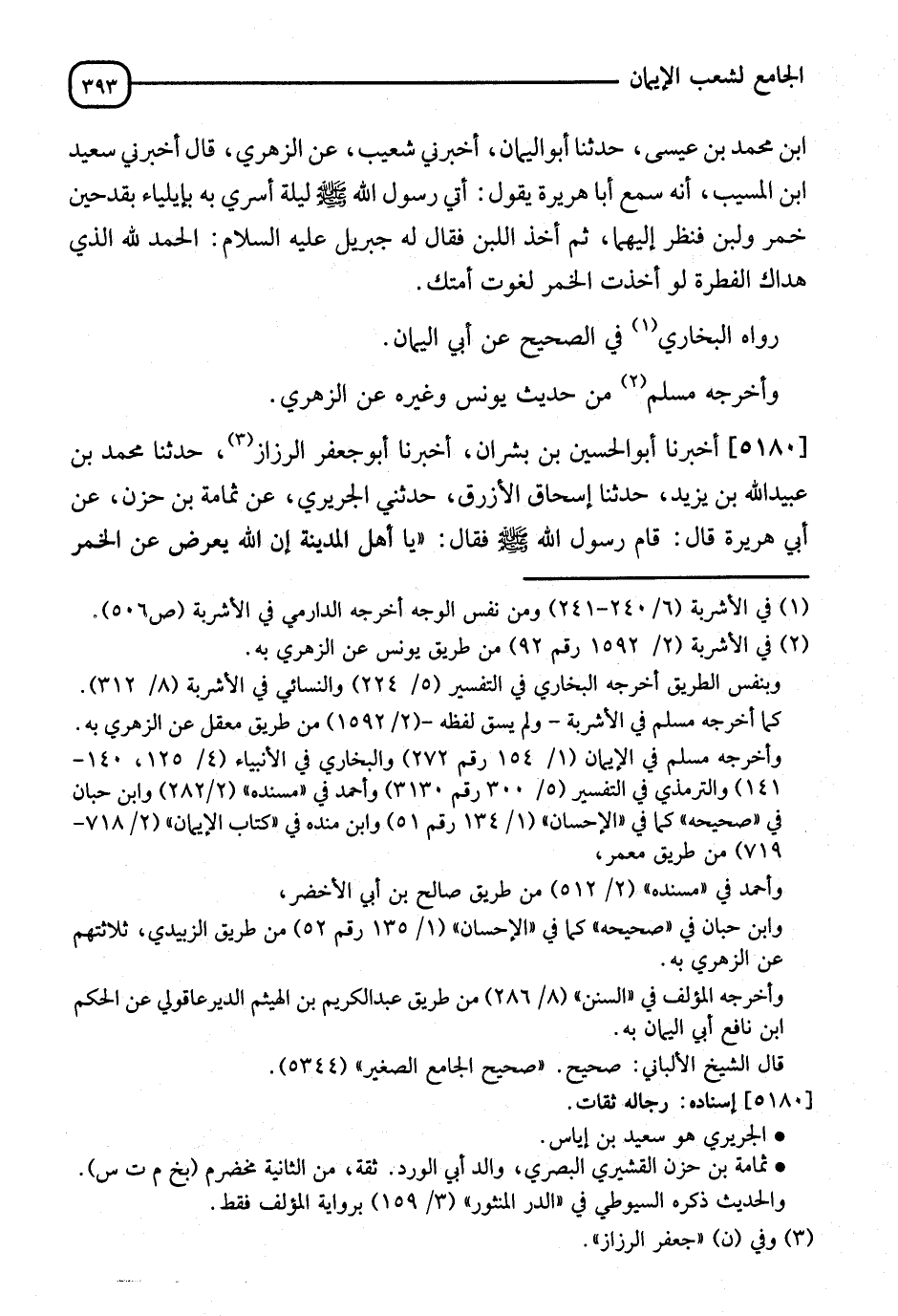 5180 - أَخْبَرَنَا أَبُو الْحُسَيْنِ بْنُ بِشْرَانَ، ثَنَا أَبُو جَعْفَرٍ الرَّزَّازُ، ثَنَا مُحَمَّدُ بْنُ عُبَيْدِ اللهِ بْنِ يَزِيدَ، ثَنَا إِسْحَاقُ الْأَزْرَقُ، حَدَّثَنِي الْجُرَيْرِيُّ، عَنْ ثُمَامَةَ بْنِ حَزْنٍ، عَنْ أَبِي هُرَيْرَةَ قَالَ: قَامَ رَسُولُ اللهِ صَلَّى اللَّهُ عَلَيْهِ وَسَلَّمَ فَقَالَ: " §يَا أَهْلَ الْمَدِينَةِ إِنَّ اللهَ يُعَرِّضُ عَن الْخَمْرَ -[394]- تَعْرِيضًا، لَا أَدْرِي لَعَلَّهُ سَيَنْزِلُ فِيهَا أَمْرٌ ثُمَّ قَامَ فَقَالَ: " يَا أَهْلَ الْمَدِينَةِ إِنَّ اللهَ قَدْ أَنْزَلَ إِلَيَّ تَحْرِيمَ الْخَمْرِ، فَمَنْ كَتَبَ مِنْكُمْ هَذِهِ الْآيَةَ وَعِنْدَهُ مِنْهَا شَيْءٌ فَلَا يَشْرَبْهَا "