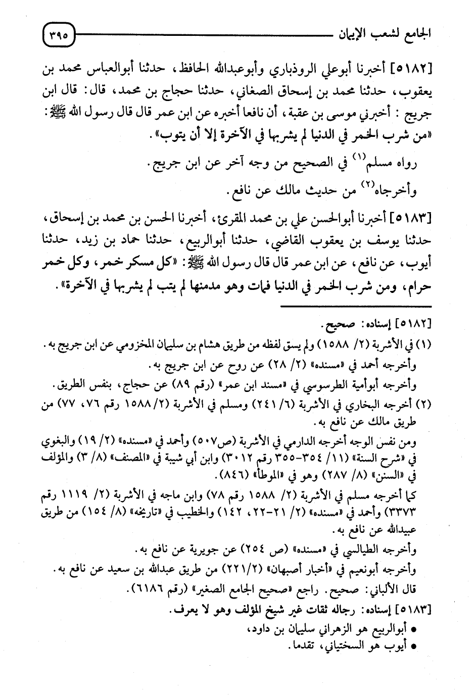 5183 - أَخْبَرَنَا أَبُو الْحَسَنِ عَلِيُّ بْنُ مُحَمَّدٍ الْمُقْرِئُ، أَنَا الْحَسَنُ بْنُ مُحَمَّدِ بْنِ إِسْحَاقَ، ثَنَا يُوسُفُ بْنُ يَعْقُوبَ الْقَاضِي، ثَنَا أَبُو الرَّبِيعِ، ثَنَا حَمَّادُ بْنُ زَيْدٍ، ثَنَا أَيُّوبُ، عَنْ نَافِعٍ، عَنِ ابْنِ عُمَرَ قَالَ: قَالَ رَسُولُ اللهِ صَلَّى اللَّهُ عَلَيْهِ وَسَلَّمَ: " §كُلُّ مُسْكِرٍ خَمْرٌ، وَكُلُّ خَمْرٍ حَرَامٌ، وَمَنْ شَرِبَ الْخَمْرَ فِي الدُّنْيَا فَمَاتَ وَهُوَ مُدْمِنُهَا وَلَمْ يَتُبْ، لَمْ يَشْرَبْهَا فِي الْآخِرَةِ " -[396]- رَوَاهُ مُسْلِمٌ فِي الصَّحِيحِ عَنْ أَبِي الرَّبِيعِ
