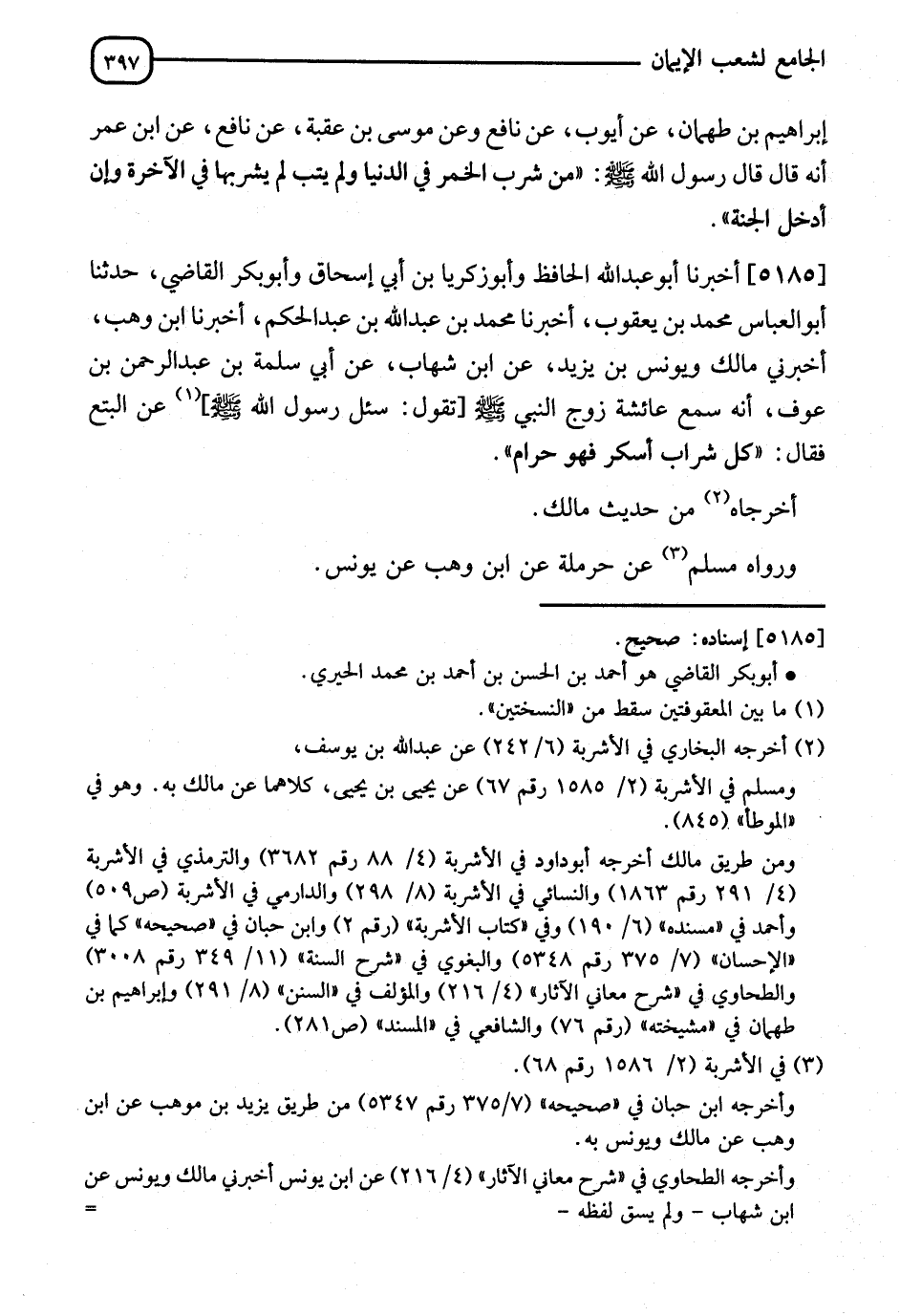 5185 - أَخْبَرَنَا أَبُو عَبْدِ اللهِ الْحَافِظُ، وَأَبُو زَكَرِيَّا بْنُ أَبِي إِسْحَاقَ، وَأَبُو بَكْرٍ الْقَاضِي، ثَنَا أَبُو الْعَبَّاسِ مُحَمَّدُ بْنُ يَعْقُوبَ، أَنَا مُحَمَّدُ بْنُ عَبْدِ اللهِ بْنِ عَبْدِ الْحَكَمِ، أَنَا ابْنُ وَهْبٍ، أَخْبَرَنِي مَالِكٌ، وَيُونُسُ بْنُ يَزِيدَ، عَنِ ابْنِ شِهَابٍ، عَنْ أَبِي سَلَمَةَ بْنِ عَبْدِ الرَّحْمَنِ بْنِ عَوْفٍ، أَنَّهُ سَمِعَ عَائِشَةَ زَوْجَ النَّبِيِّ صَلَّى اللَّهُ عَلَيْهِ وَسَلَّمَ تَقُولُ: سُئِلَ النَّبِيُّ صَلَّى اللَّهُ عَلَيْهِ وَسَلَّمَ عَنِ الْبِتْعِ فَقَالَ: §" كُلُّ شَرَابٍ أَسْكَرَ فَهُوَ حَرَامٌ " أَخْرَجَاهُ مِنْ حَدِيثِ مَالِكٍ، وَرَوَاهُ مُسْلِمٌ، عَنْ حَرْمَلَةَ، عَنِ ابْنِ وَهْبٍ، عَنْ يُونُسَ
