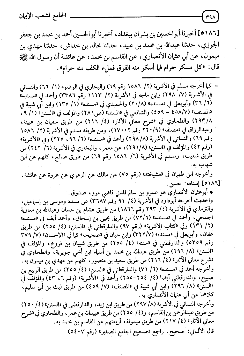 5186 - أَخْبَرَنَا أَبُو الْحُسَيْنِ بْنُ بِشْرَانَ، بِبَغْدَادَ، أَنَا أَبُو الْحُسَيْنِ أَحْمَدُ بْنُ مُحَمَّدِ بْنِ جَعْفَرٍ الْجَوْزِيُّ، ثَنَا عَبْدُ اللهِ بْنُ مُحَمَّدِ بْنِ عُبَيْدٍ، ثَنَا خَالِدُ بْنُ خِدَاشٍ، ثَنَا مَهْدِيُّ بْنُ مَيْمُونٍ، عَنْ أَبِي عُثْمَانَ الْأَنْصَارِيِّ، عَنِ الْقَاسِمِ بْنِ مُحَمَّدٍ، عَنْ عَائِشَةَ، أَنَّ رَسُولَ اللهِ صَلَّى اللَّهُ عَلَيْهِ وَسَلَّمَ قَالَ: §" كُلُّ مُسْكِرٍ حَرَامٌ فَمَا أَسْكَرَ مِنْهُ الْفَرْقُ فَمِلْءُ الْكَفِّ مِنْهُ حَرَامٌ "