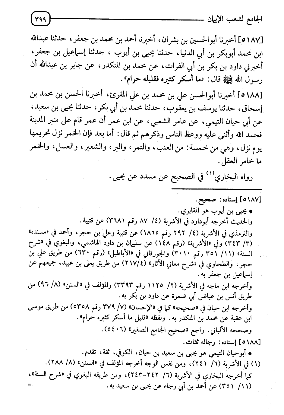 5188 - أَخْبَرَنَا أَبُو الْحَسَنِ عَلِيُّ بْنُ مُحَمَّدِ بْنِ عَلِيٍّ الْمُقْرِئُ، أَنَا الْحَسَنُ بْنُ مُحَمَّدِ بْنِ إِسْحَاقَ، ثَنَا يُوسُفُ بْنُ يَعْقُوبَ، ثَنَا مُحَمَّدُ بْنُ أَبِي بَكْرٍ، ثَنَا يَحْيَى بْنُ سَعِيدٍ، عَنْ أَبِي حَيَّانَ التَّيْمِيِّ، عَنْ عَامِرٍ الشَّعْبِيِّ، عَنِ ابْنِ عُمَرَ: أَنَّ عُمَرَ قَامَ عَلَى مِنْبَرِ الْمَدِينَةِ فَحَمِدَ اللهَ وَأَثْنَى عَلَيْهِ، وَوَعَظَ النَّاسَ وَذَكَّرَهُمْ ثُمَّ قَالَ: " أَمَّا بَعْدُ فَإِنَّ §الْخَمْرَ نَزَلَ تَحْرِيمُهَا يَوْمَ نَزَلَ وَهِيَ مِنْ خَمْسَةٍ مِنَ الْعِنَبِ وَالتَّمْرِ وَالْبُرِّ وَالشَّعِيرِ وَالْعَسَلِ وَالْخَمْرُ مَا خَامَرَ الْعَقْلَ " رَوَاهُ الْبُخَارِيُّ فِي الصَّحِيحِ، عَنْ مُسَدَّدٍ، عَنْ يَحْيَى