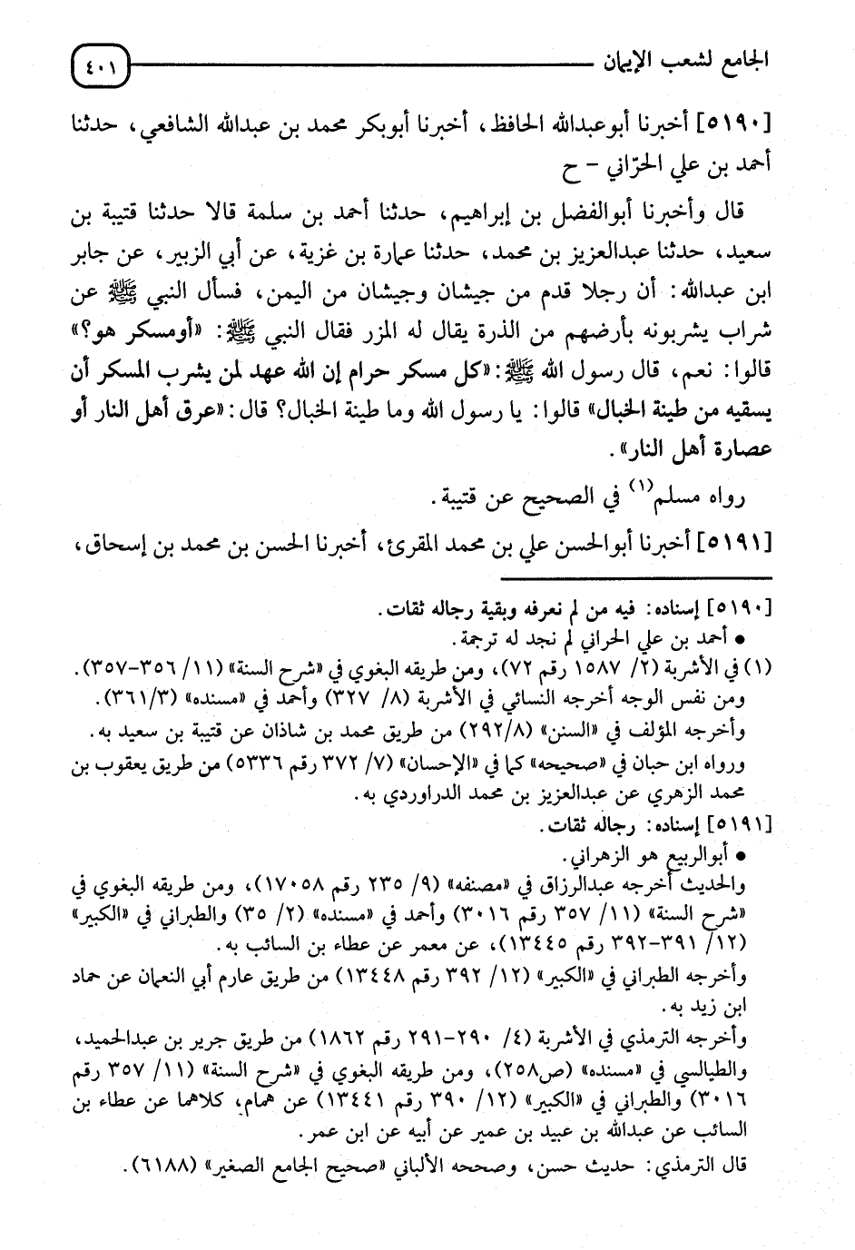 5190 - أَخْبَرَنَا أَبُو عَبْدِ اللهِ الْحَافِظُ، أَنَا أَبُو بَكْرٍ مُحَمَّدُ بْنُ عَبْدِ اللهِ الشَّافِعِيُّ، ثَنَا أَحْمَدُ بْنُ عَلِيٍّ الْحَرَّانِيُّ، ح قَالَ: وَأَخْبَرَنَا أَبُو الْفَضْلِ بْنُ إِبْرَاهِيمَ، ثَنَا أَحْمَدُ بْنُ سَلَمَةَ قَالَا: حَدَّثَنَا قُتَيْبَةُ بْنُ سَعِيدٍ، ثَنَا عَبْدُ الْعَزِيزِ بْنُ مُحَمَّدٍ، ثَنَا عُمَارَةُ بْنُ غَزِيَّةَ، عَنْ أَبِي الزُّبَيْرِ، عَنْ جَابِرِ بْنِ عَبْدِ اللهِ: أَنَّ رَجُلًا قَدِمَ مِنْ جَيْشَانَ وَجَيْشَانُ مِنَ الْيَمَنِ فَسَأَلَ النَّبِيَّ صَلَّى اللَّهُ عَلَيْهِ وَسَلَّمَ، عَنْ شَرَابٍ يَشْرَبُونَهُ بِأَرْضِهِمْ مِنَ الذُّرَةِ يُقَالُ لَهُ: الْمِزْرُ فَقَالَ النَّبِيُّ صَلَّى اللَّهُ عَلَيْهِ وَسَلَّمَ: " أَوَ مُسْكِرٌ هُوَ؟ " قَالُوا: نَعَمْ، قَالَ رَسُولُ اللهِ صَلَّى اللَّهُ عَلَيْهِ وَسَلَّمَ: §" كُلُّ مُسْكِرٍ حَرَامٌ إِنَّ اللهَ عَهِدَ لِمَنْ يَشْرَبُ الْمُسْكِرَ أَنْ يَسْقِيَهُ مِنَ طِينَةِ الْخَبَالِ قَالُوا: يَا رَسُولَ اللهِ وَمَا طِينَةُ الْخَبَالِ؟ قَالَ: " عَرَقُ أَهْلِ النَّارِ أَوْ عُصَارَةُ أَهْلِ النَّارِ " رَوَاهُ مُسْلِمٌ فِي الصَّحِيحِ، عَنْ قُتَيْبَةَ