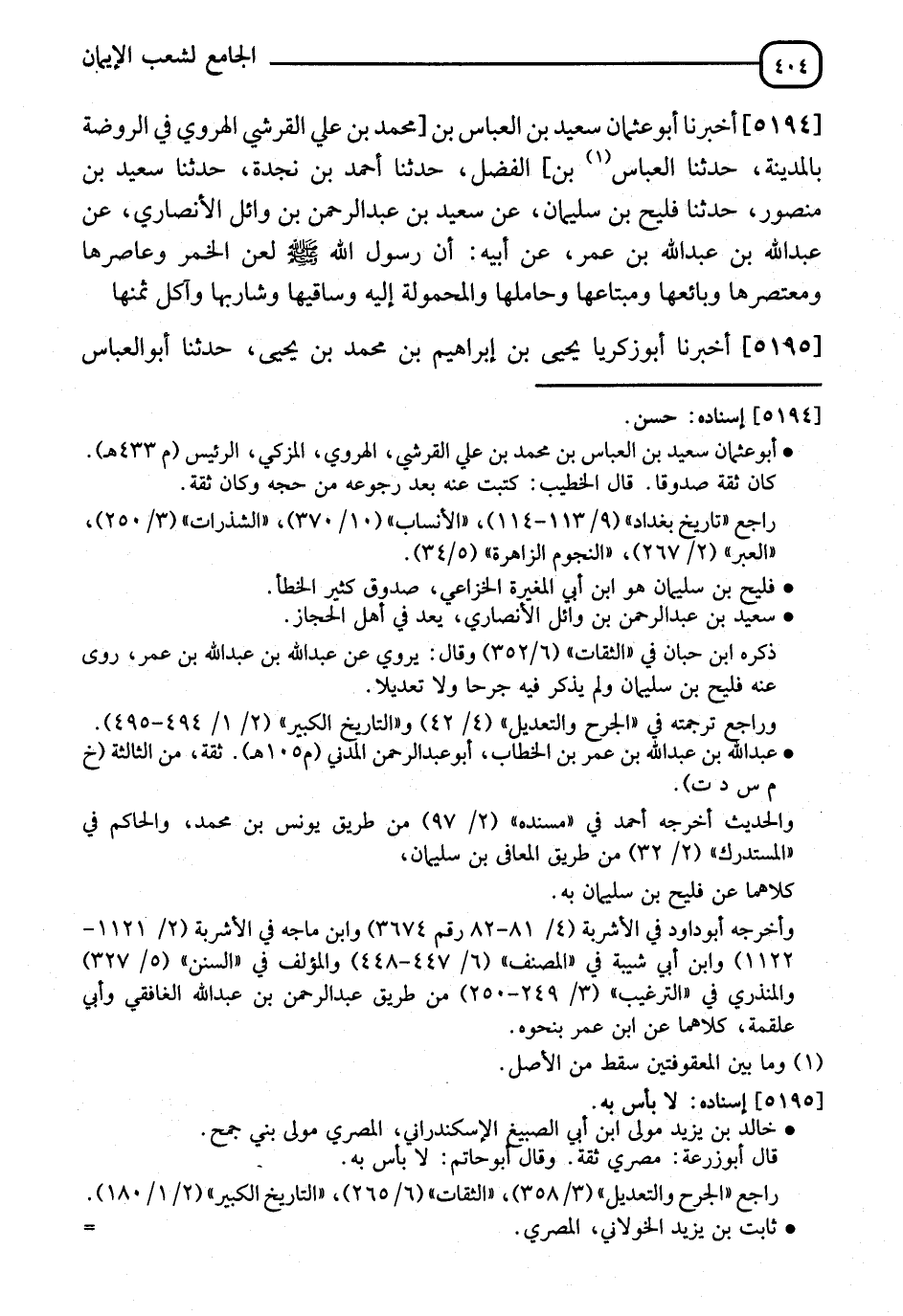 5194 - أَخْبَرَنَا أَبُو عُثْمَانَ سَعِيدُ بْنُ الْعَبَّاسِ بْنِ مُحَمَّدِ بْنِ عَلِيٍّ الْقُرَشِيُّ الْهَرَوِيُّ فِي الرَّوْضَةِ بِالْمَدِينَةِ، ثَنَا الْعَبَّاسُ بْنُ الْفَضْلِ، ثَنَا أَحْمَدُ بْنُ نَجْدَةَ، ثَنَا سَعِيدُ بْنُ مَنْصُورٍ، ثَنَا فُلَيْحُ بْنُ سُلَيْمَانَ، عَنْ سَعِيدِ بْنِ عَبْدِ الرَّحْمَنِ بْنِ وَائِلٍ الْأَنْصَارِيِّ، عَنْ عَبْدِ اللهِ بْنِ عَبْدِ اللهِ بْنِ عُمَرَ، عَنْ أَبِيهِ: أَنَّ رَسُولَ اللهِ صَلَّى اللَّهُ عَلَيْهِ وَسَلَّمَ: §" لَعَنَ الْخَمْرَ وَعَاصِرَهَا وَمُعْتَصِرَهَا وَبَائِعَهَا وَمُبْتَاعَهَا وَحَامِلَهَا وَالْمَحْمُولَةَ إِلَيْهِ وَسَاقِيَهَا وَشَارِبَهَا وَآكِلَ ثَمَنِهَا "
