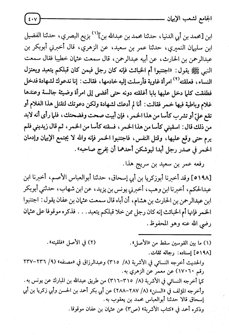 5198 - أَخْبَرَنَاهُ أَبُو زَكَرِيَّا بْنُ أَبِي إِسْحَاقَ، ثَنَا أَبُو الْعَبَّاسِ الْأَصَمُّ، أَنَا ابْنُ عَبْدِ الْحَكَمِ، أَنَا ابْنُ وَهْبٍ، أَخْبَرَنِي يُونُسُ بْنُ يَزِيدَ، عَنِ ابْنِ شِهَابٍ، حَدَّثَنِي أَبُو بَكْرِ بْنُ عَبْدِ الرَّحْمَنِ بْنِ الْحَارِثِ بْنِ هِشَامٍ: أَنَّ أَبَاهُ قَالَ: سَمِعْتُ عُثْمَانَ بْنَ عَفَّانَ يَقُولُ: §" اجْتَنِبُوا الْخَمْرَ فَإِنَّهَا أُمُّ الْخَبَائِثِ إِنْ كَانَ رَجُلٌ مِمَّنْ خَلَا قَبْلَكُمْ يَتَعَبَّدُ " فَذَكَرَهُ مَوْقُوفًا عَلَى عُثْمَانَ رَضِيَ اللهُ عَنْهُ وَهُوَ الْمَحْفُوظُ