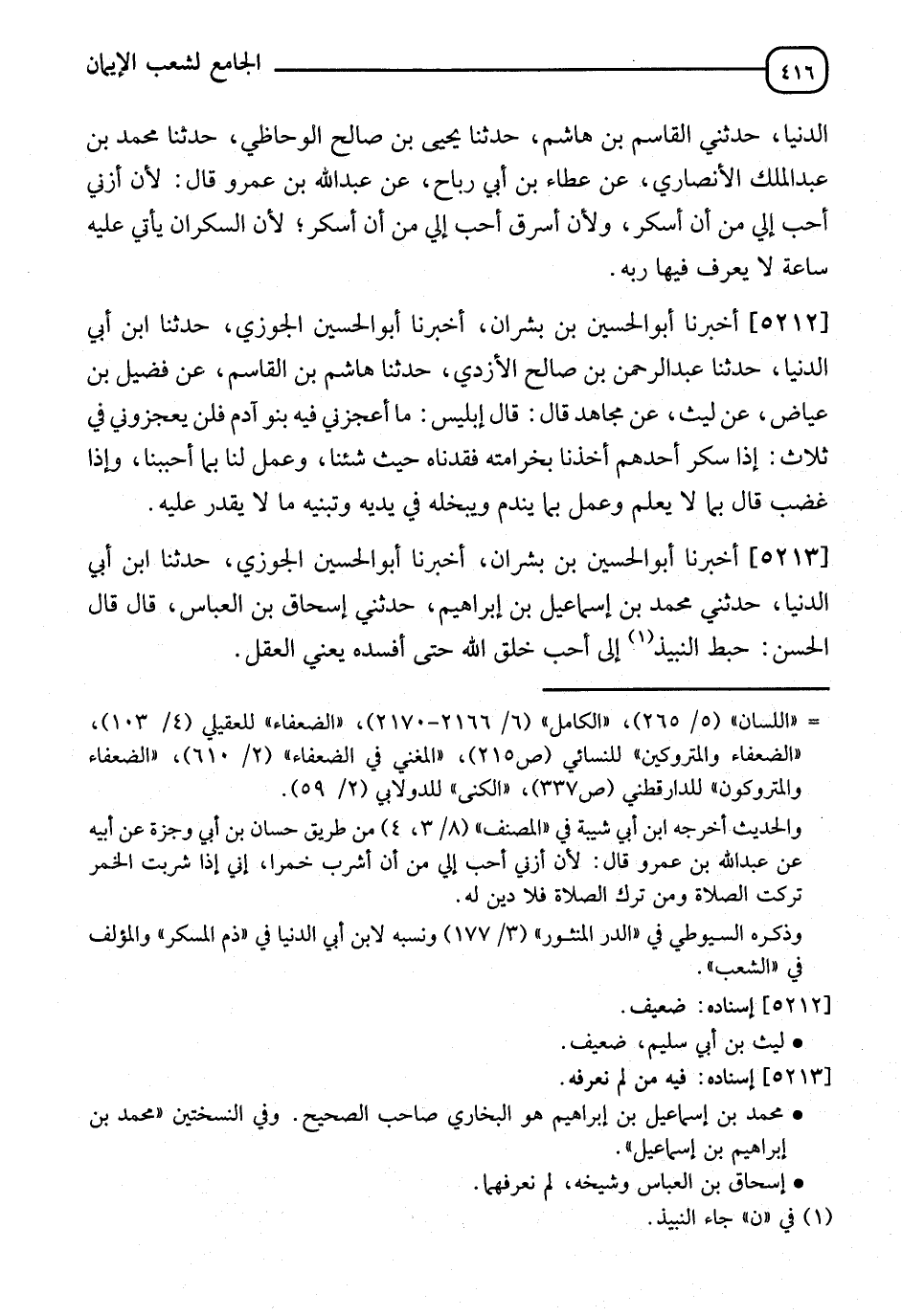 5213 - أَخْبَرَنَا أَبُو الْحُسَيْنِ بْنُ بِشْرَانَ، أَنَا أَبُو الْحُسَيْنِ الْجَوْزِيُّ، ثَنَا ابْنُ أَبِي الدُّنْيَا، حَدَّثَنِي مُحَمَّدُ بْنُ إِبْرَاهِيمَ بْنِ إِسْمَاعِيلَ، حَدَّثَنِي إِسْحَاقُ بْنُ الْعَبَّاسِ قَالَ: قَالَ الْحَسَنُ: §" جَاءَ النَّبِيذُ إِلَى أَحَبِّ خَلْقِ اللهِ حَتَّى أَفْسَدَهُ يَعْنِي الْعَقْلَ "