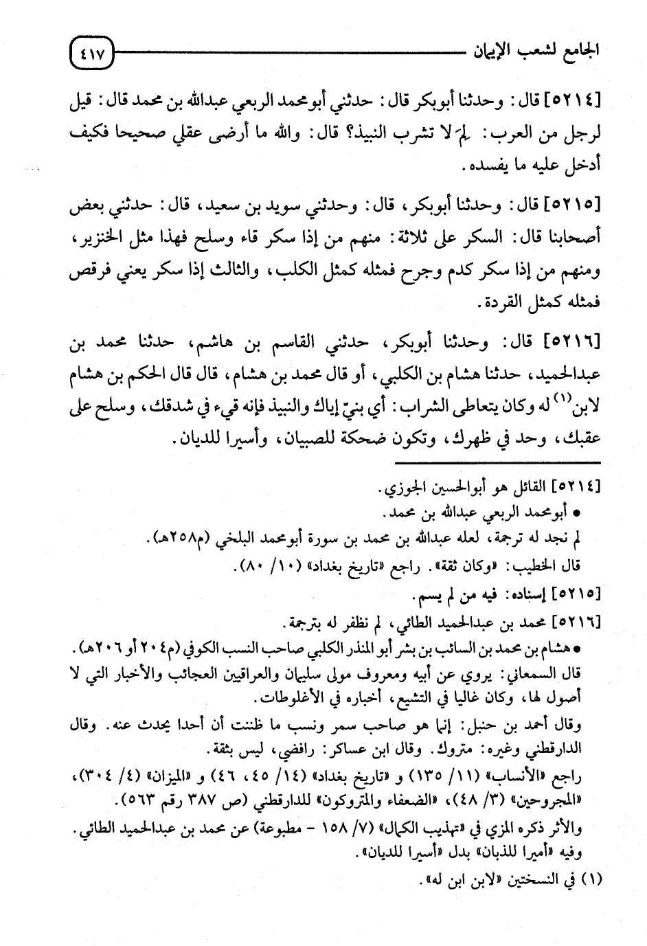 5216 - قَالَ: وَحَدَّثَنَا أَبُو بَكْرٍ، حَدَّثَنِي الْقَاسِمُ بْنُ هَاشِمٍ، ثَنَا مُحَمَّدُ بْنُ عَبْدِ الْحَمِيدِ، ثَنَا هِشَامُ بْنُ الْكَلْبِيِّ أَوْ قَالَ: مُحَمَّدُ بْنُ هِشَامٍ قَالَ: قَالَ الْحَكَمُ بْنُ هِشَامٍ: لِابْنِ ابْنٍ لَهُ وَكَانَ يَتَعَاطَى الشَّرَابَ: " أَيْ بُنَيَّ §إِيَّاكَ وَالنَّبِيذَ إِنَّهُ قَيْءٌ فِي شِدْقِكَ وَسَلَحَ عَلَى عَقِبِكَ، وَحَدٌّ فِي ظَهْرِكَ، وَتَكُونُ ضَحْكَةً لِلصِّبْيَانِ، وَأَسِيرًا لِلدَّيَّانِ "