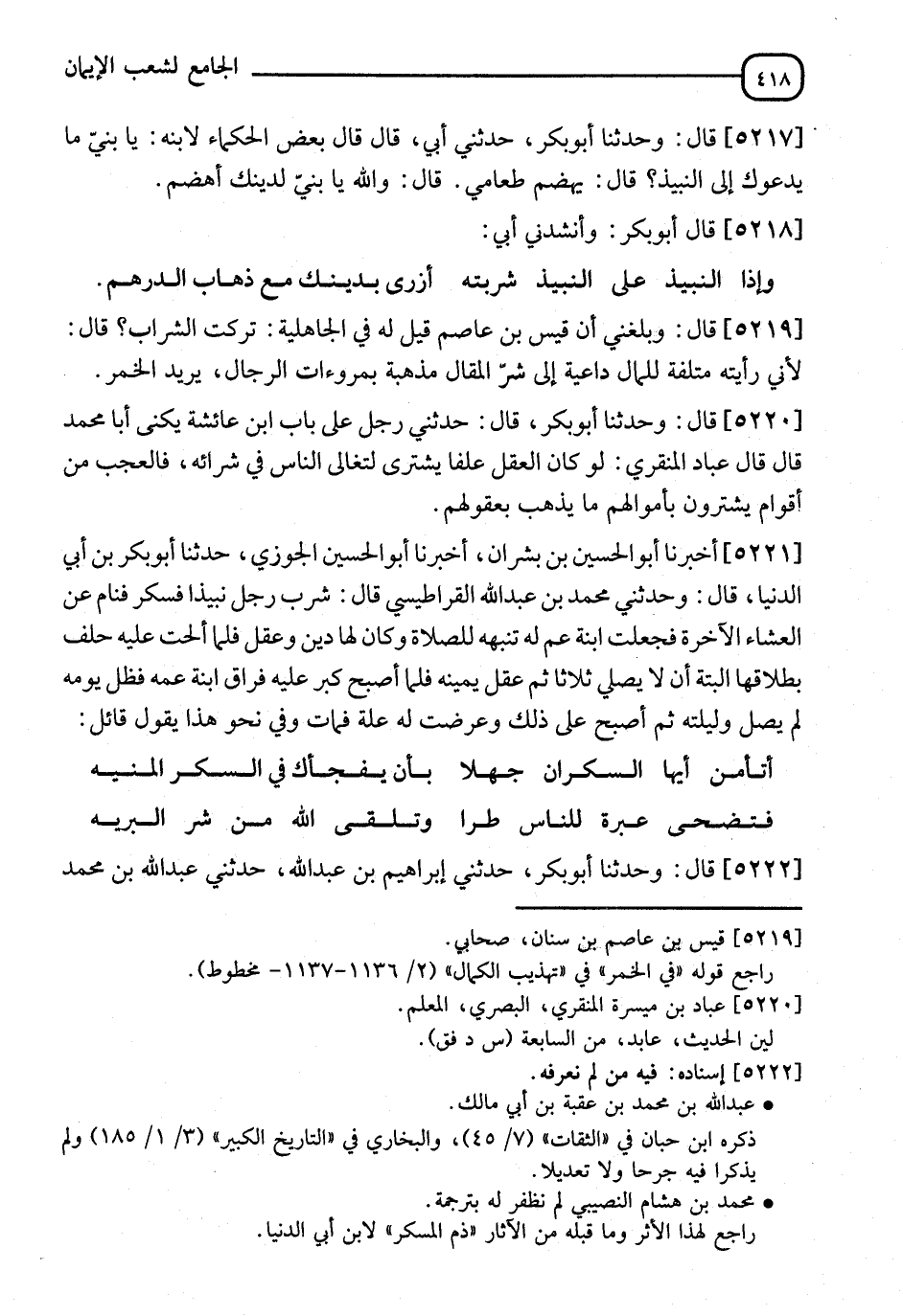 5219 - قَالَ: وَبَلَغَنِي أَنَّ قَيْسَ بْنَ عَاصِمٍ قِيلَ لَهُ فِي الْجَاهِلِيَّةِ: §لَمْ تَرَكْتَ الشَّرَابَ؟ قَالَ: " لِأَنِّي رَأَيْتُهُ مَتْلَفَةً لِلْمَالِ، دَاعِيَةً إِلَى شَرِّ الْمَقَالِ، مَذْهَبَةً لِمُرَوءَاتِ الرِّجَالِ، يُرِيدُ الْخَمْرَ "