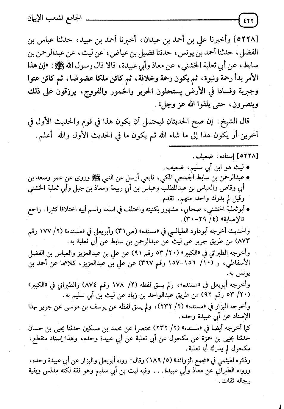 5228 - وَأَخْبَرَنَا عَلِيُّ بْنُ أَحْمَدَ بْنِ عَبْدَانَ، أَنَا أَحْمَدُ بْنُ عُبَيْدٍ، ثَنَا عَبَّاسُ بْنُ الْفَضْلِ، ثَنَا أَحْمَدُ بْنُ يُونُسَ، ثَنَا فُضَيْلُ بْنُ عِيَاضٍ، عَنْ لَيْثٍ، عَنْ عَبْدِ الرَّحْمَنِ بْنِ سَابِطٍ، عَنْ أَبِي ثَعْلَبَةَ الْخُشَنِيِّ، عَنْ مُعَاذٍ، وَأَبِي عُبَيْدَةَ قَالَا: قَالَ رَسُولُ اللهِ صَلَّى اللَّهُ عَلَيْهِ وَسَلَّمَ: " §إِنَّ هَذَا الْأَمْرَ بَدَأَ رَحْمَةً، وَنُبَوَّةً، ثُمَّ يَكُونُ رَحْمَةً، وَخِلَافَةً، ثُمَّ كَائِنٌ مُلْكًا عَضُوضًا، ثُمَّ كَائِنٌ عُتَوًّا، وَحَرْبَةً، وَفَسَادًا فِي الْأَرْضِ، يَسْتَحِلُّونَ الْحَرِيرَ، وَالْخُمُورَ، وَالْفُرُوجَ، يُرْزَقُونَ عَلَى ذَلِكَ، وَيُنْصَرُونَ حَتَّى يُلْقَى اللهَ عَزَّ وَجَلَّ " قَالَ الشَّيْخُ: " إِنْ صَحَّ الْحَدِيثَانِ فَيُحْتَمَلُ أَنْ يَكُونَ هَذَا فِي قَوْمٍ، وَالْحَدِيثُ الْأَوَّلُ فِي آخَرِينَ، أَوْ يَكُونَ هَذَا إِلَى مَا شَاءَ اللهُ، ثُمَّ يَكُونُ مَا فِي الْحَدِيثِ الْأَوَّلِ، وَاللهُ أَعْلَمُ "