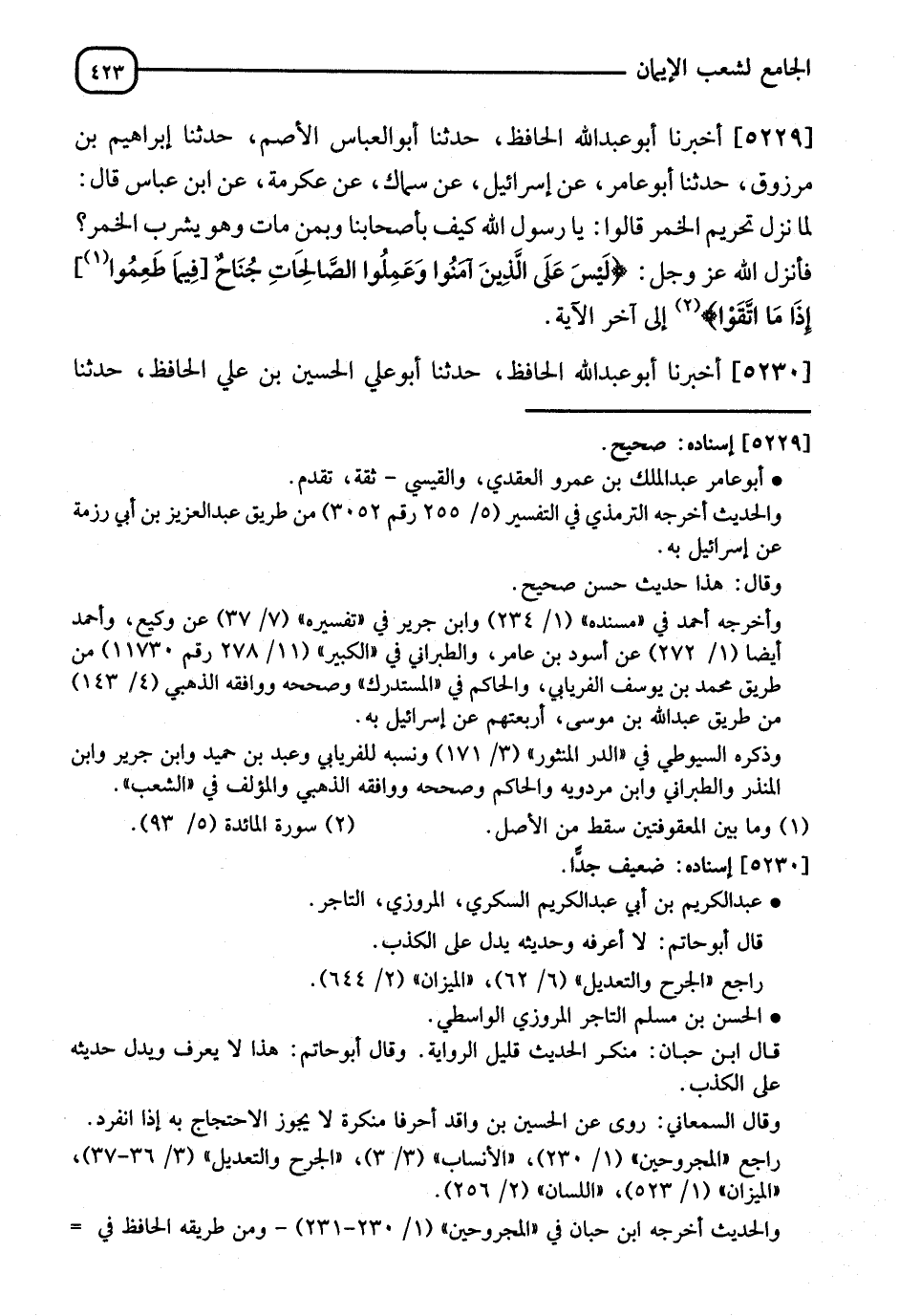 5229 - أَخْبَرَنَا أَبُو عَبْدِ اللهِ الْحَافِظُ، ثَنَا أَبُو الْعَبَّاسِ الْأَصَمُّ، ثَنَا إِبْرَاهِيمُ بْنُ مَرْزُوقٍ، ثَنَا أَبُو عَامِرٍ، عَنْ إِسْرَائِيلَ، عَنْ سِمَاكٍ، عَنْ عِكْرِمَةَ، عَنِ ابْنِ عَبَّاسٍ قَالَ: لَمَّا نَزَلَ تَحْرِيمُ الْخَمْرِ قَالُوا: يَا رَسُولَ اللهِ، كَيْفَ بِأَصْحَابِنَا، وَبِمَنْ مَاتَ، وَهُوَ يَشْرَبُ الْخَمْرَ؟ فَأَنْزَلَ اللهُ عَزَّ وَجَلَّ: " {§لَيْسَ عَلَى الَّذِينَ آمَنُوا وَعَمِلُوا الصَّالِحَاتِ جُنَاحٌ فِيمَا طَعِمُوا إِذَا مَا اتَّقَوْا} [المائدة: 93] " إِلَى آخِرِ الْآيَةِ