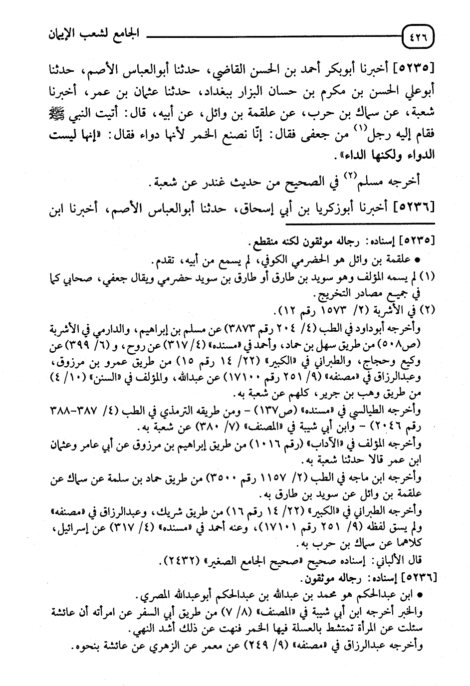 5235 - أَخْبَرَنَا أَبُو بَكْرٍ أَحْمَدُ بْنُ الْحَسَنِ الْقَاضِي، ثَنَا أَبُو الْعَبَّاسِ الْأَصَمُّ، ثَنَا أَبُو عَلِيٍّ الْحَسَنُ بْنُ مُكْرَمِ بْنِ حَسَّانٍ الْبَزَّارُ، بِبَغْدَادَ، ثَنَا عُثْمَانُ بْنُ عُمَرَ، أَنَا شُعْبَةُ، عَنْ سِمَاكِ بْنِ حَرْبٍ، عَنْ عَلْقَمَةَ بْنِ وَائِلٍ، عَنْ أَبِيهِ قَالَ: أَتَيْتُ النَّبِيَّ صَلَّى اللَّهُ عَلَيْهِ وَسَلَّمَ، فَقَامَ إِلَيْهِ رَجُلٌ مِنْ جُعْفِيٍّ فَقَالَ: إِنَّا نَصْنَعُ الْخَمْرَ لِأَنَّهَا دَوَاءٌ فَقَالَ: " §إِنَّهَا لَيْسَتِ الدَّوَاءَ، وَلَكِنَّهَا الدَّاءُ " أَخْرَجَهُ مُسْلِمٌ فِي الصَّحِيحِ مِنْ حَدِيثِ غُنْدَرٍ، عَنْ شُعْبَةَ
