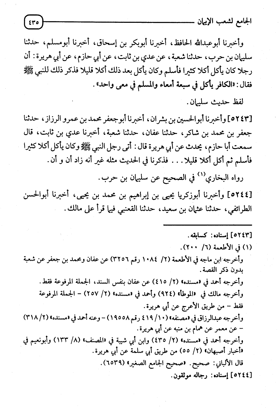 5244 - وَأَخْبَرَنَا أَبُو زَكَرِيَّا يَحْيَى بْنُ إِبْرَاهِيمَ بْنِ مُحَمَّدِ بْنِ يَحْيَى، أَنَا أَبُو الْحَسَنِ الطَّرَائِفِيُّ، ثَنَا عُثْمَانُ بْنُ سَعِيدٍ، ثَنَا الْقَعْنَبِيُّ، فِيمَا يَقْرَأُ عَلَى مَالِكٍ، -[436]- وَأَخْبَرَنَا أَبُو عَبْدِ اللهِ الْحَافِظُ، أَخْبَرَنِي أَبُو النَّضْرِ الْفَقِيهُ، حَدَّثَنَا الْحَارِثُ بْنُ أَبِي أُسَامَةَ، ثَنَا إِسْحَاقُ بْنُ عِيسَى الطَّبَّاعُ، عَنْ مَالِكٍ، عَنْ سُهَيْلٍ، عَنْ أَبِيهِ، عَنْ أَبِي هُرَيْرَةَ: أَنَّ رَسُولَ اللهِ صَلَّى اللَّهُ عَلَيْهِ وَسَلَّمَ، ضَافَهُ ضَيْفٌ وَهُوَ كَافِرٌ، فَأَمَرَ لَهُ رَسُولُ اللهِ صَلَّى اللَّهُ عَلَيْهِ وَسَلَّمَ، بِشَاةٍ حُلِبَتْ فَشَرِبَ، ثُمَّ أُخْرَى، فَشَرِبَ حَتَّى شَرِبَ حِلَابَ سَبْعِ شِيَاهٍ، ثُمَّ أَصْبَحَ فَأَسْلَمَ، فَأَمَرَ لَهُ رَسُولُ اللهِ صَلَّى اللَّهُ عَلَيْهِ وَسَلَّمَ بِشَاةٍ، فَشَرِبَ حِلَابَهَا، ثُمَّ أَمَرَ بِأُخْرَى، فَلَمْ يَسْتَتِمَّهَا، فَقَالَ رَسُولُ اللهِ صَلَّى اللَّهُ عَلَيْهِ وَسَلَّمَ: " §الْمُؤْمِنُ يَشْرَبُ فِي مِعًى وَاحِدٍ، وَالْكَافِرُ يَأْكُلُ فِي سَبْعَةِ أَمْعَاءٍ "