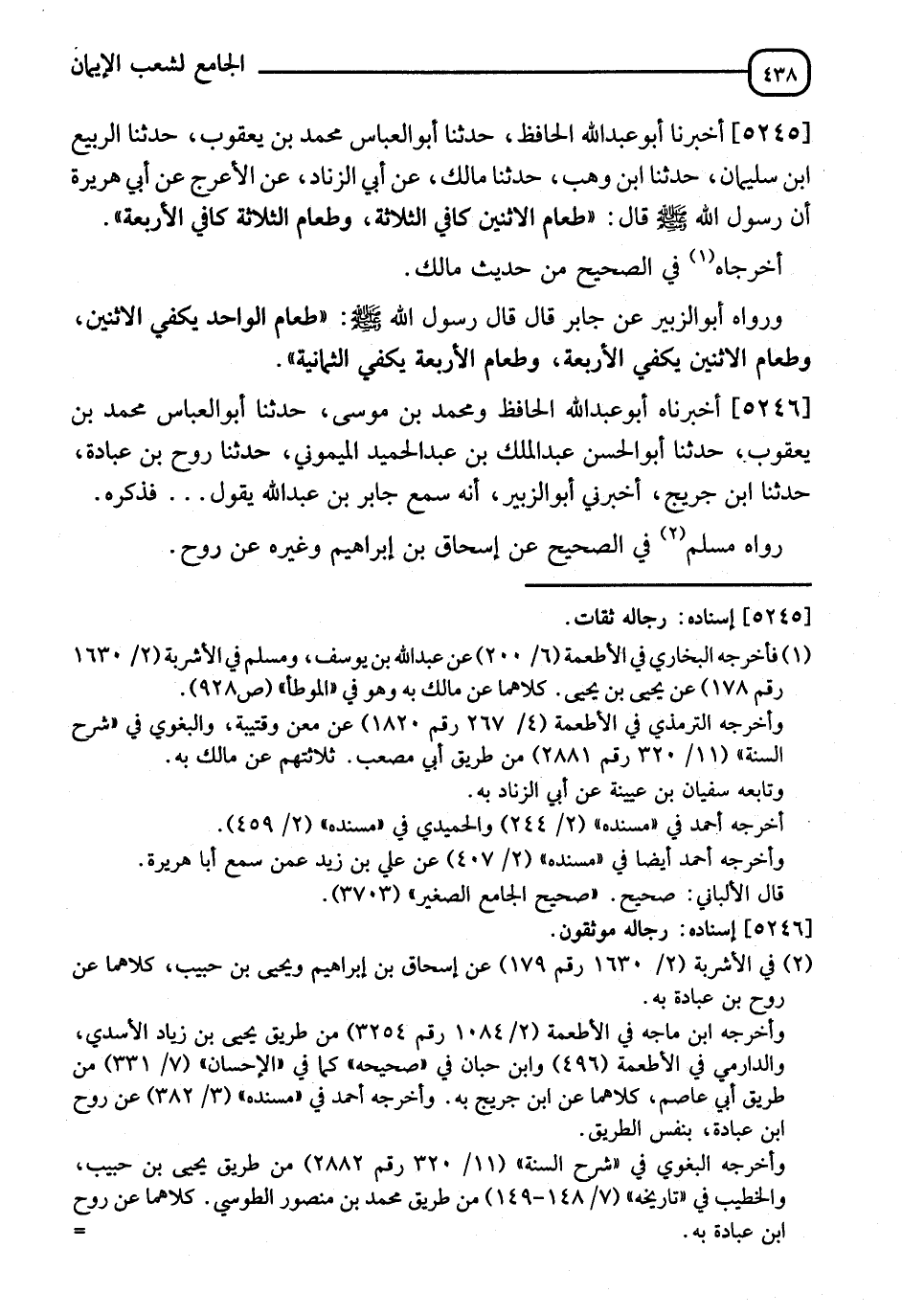 5246 - وَرَوَاهُ أَبُو الزُّبَيْرِ، عَنْ جَابِرٍ قَالَ: قَالَ رَسُولُ اللهِ صَلَّى اللَّهُ عَلَيْهِ وَسَلَّمَ: " §طَعَامُ الْوَاحِدِ يَكْفِي الِاثْنَيْنِ، وَطَعَامُ الِاثْنَيْنِ يَكْفِي الْأَرْبَعَةَ، وَطَعَامُ الْأَرْبَعَةِ يَكْفِي الثَّمَانِيَةَ " أَخْبَرَنَاهُ أَبُو عَبْدِ اللهِ الْحَافِظُ، وَمُحَمَّدُ بْنُ مُوسَى، ثَنَا أَبُو الْعَبَّاسِ مُحَمَّدُ بْنُ يَعْقُوبَ، ثَنَا أَبُو الْحَسَنِ عَبْدُ الْمَلِكِ بْنُ عَبْدِ الْحَمِيدِ الْمَيْمُونِيُّ، ثَنَا رَوْحُ بْنُ عُبَادَةَ، ثَنَا ابْنُ جُرَيْجٍ، أَخْبَرَنِي أَبُو الزُّبَيْرِ، أَنَّهُ سَمِعَ جَابِرَ بْنَ عَبْدِ اللهِ، يَقُولُ: فَذَكَرَهُ. رَوَاهُ مُسْلِمٌ فِي الصَّحِيحِ، عَنْ إِسْحَاقَ بْنِ إِبْرَاهِيمَ وَغَيْرُهُ، عَنْ رَوْحٍ
