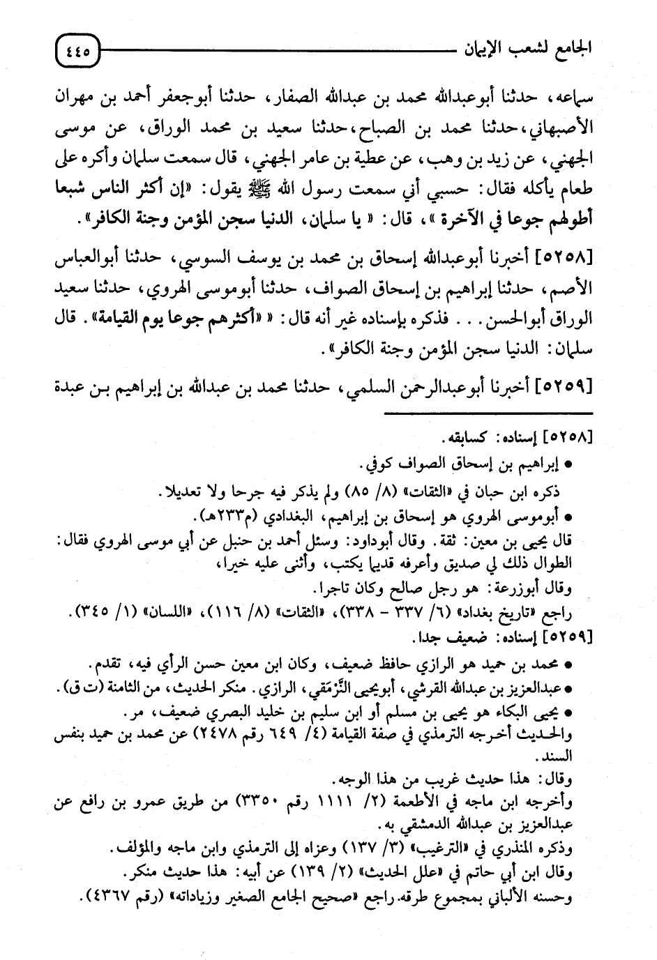 5259 - أَخْبَرَنَا أَبُو عَبْدِ الرَّحْمَنِ السُّلَمِيُّ، ثَنَا مُحَمَّدُ بْنُ عَبْدِ اللهِ بْنِ إِبْرَاهِيمَ بْنِ عَبْدَةَ -[446]- السَّلِيطِيُّ، ثَنَا جَعْفَرُ بْنُ أَحْمَدَ بْنِ نَصْرٍ الْحَافِظُ، ثَنَا مُحَمَّدُ بْنُ حُمَيْدٍ، ثَنَا عَبْدُ الْعَزِيزِ بْنُ عَبْدِ اللهِ الْقُرَشِيُّ، عَنْ يَحْيَى الْبَكَّاءِ، عَنِ ابْنِ عُمَرَ قَالَ: تَجَشَّأَ رَجُلٌ، عِنْدَ النَّبِيِّ صَلَّى اللَّهُ عَلَيْهِ وَسَلَّمَ، فَقَالَ: " §كُفَّ جُشَاءَكَ عَنَّا، فَإِنَّ أَكْثَرَكُمْ شِبَعًا فِي الدُّنْيَا، أَكْثَرُكُمْ جُوعًا يَوْمَ الْقِيَامَةِ "