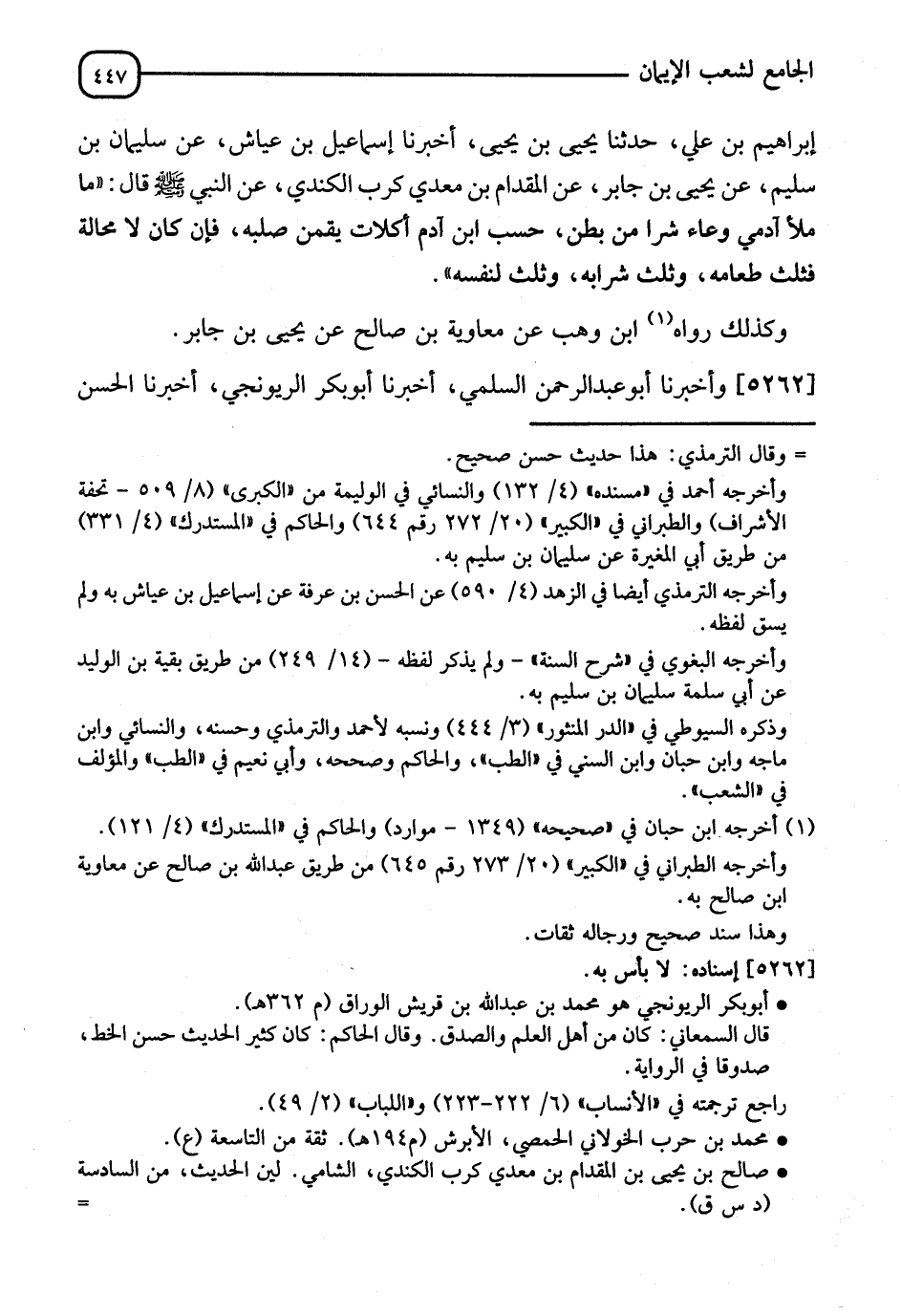 5262 - أَخْبَرَنَا أَبُو عَبْدِ الرَّحْمَنِ السُّلَمِيُّ، أَنَا أَبُو بَكْرٍ الرِّيَاحِيُّ، أَنَا الْحَسَنُ -[448]- بْنُ سُفْيَانَ، ثَنَا مُحَمَّدُ بْنُ الْمُتَوَكِّلِ، ثَنَا مُحَمَّدُ بْنُ حَرْبٍ، ثَنَا أَبُو سَلَمَةَ سُلَيْمَانُ بْنُ سُلَيْمٍ، عَنْ صَالِحِ بْنِ يَحْيَى بْنِ الْمِقْدَامِ بْنِ مَعْدِي كَرِبَ، عَنْ أَبِيهِ، عَنْ جَدِّهِ الْمِقْدَامِ قَالَ: سَمِعْتُ وَأَخْبَرَنَا عَلِيُّ بْنُ أَحْمَدَ بْنِ عَبْدَانَ، أَنَا أَحْمَدُ بْنُ عُبَيْدٍ الصَّفَارُ، ثَنَا أَحْمَدُ بْنُ بِشْرٍ الْمَرْثِدِيُّ، ثَنَا حَاجِبُ بْنُ الْوَلِيدِ، ثَنَا مُحَمَّدُ بْنُ حَرْبٍ، عَنْ أَبِي سَلَمَةَ سُلَيْمَانَ بْنِ سُلَيْمٍ، عَنْ يَحْيَى بْنِ جَابِرٍ الطَّائِيِّ، وَصَالِحِ بْنِ يَحْيَى بْنِ الْمِقْدَامِ، عَنْ أَبِيهِ، عَنْ جَدِّهِ قَالَ: قَالَ رَسُولُ اللهِ صَلَّى اللَّهُ عَلَيْهِ وَسَلَّمَ: " §مَا مَلَأ آدَمِيٌّ وِعَاءً شَرًّا مِنْ بَطْنِهِ، حَسْبُكَ يَا قُدَيْمُ لُقْمَاتٌ، يُقِمْنَ صُلْبَكَ، فَإِنْ أَبِيتَ " وَفِي رِوَايَةِ السُّلَمِيِّ: إِنْ كَانَ لَا بُدَّ، فَثُلُثٌ طَعَامٌ، وَثُلُثٌ شَرَابٌ، وَثُلُثٌ لِلنَّفَسِ، وَفِي رِوَايَةِ السُّلَمِيِّ وَثُلُثٌ نَفَسٌ