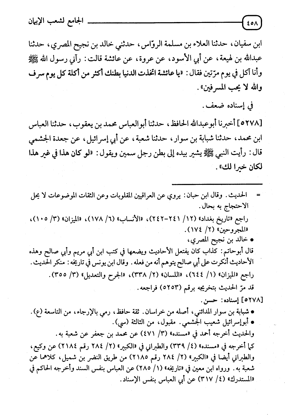 5278 - أَخْبَرَنَا أَبُو عَبْدِ اللهِ الْحَافِظُ، ثَنَا أَبُو الْعَبَّاسِ مُحَمَّدُ بْنُ يَعْقُوبَ، ثَنَا الْعَبَّاسُ بْنُ مُحَمَّدٍ، ثَنَا شَبَابَةُ بْنُ سَوَّارٍ، ثَنَا شُعْبَةُ، عَنْ أَبِي إِسْرَائِيلَ، عَنْ جَعْدَةَ الْجُشَمِيِّ قَالَ: رَأَيْتُ النَّبِيَّ صَلَّى اللَّهُ عَلَيْهِ وَسَلَّمَ، يُشِيرُ بِيَدِهِ، إِلَى بَطْنِ رَجُلٍ سَمِينٍ وَيَقُولُ: §" لَوْ كَانَ هَذَا فِي غَيْرِ هَذَا لَكَانَ خَيْرًا لَكَ "