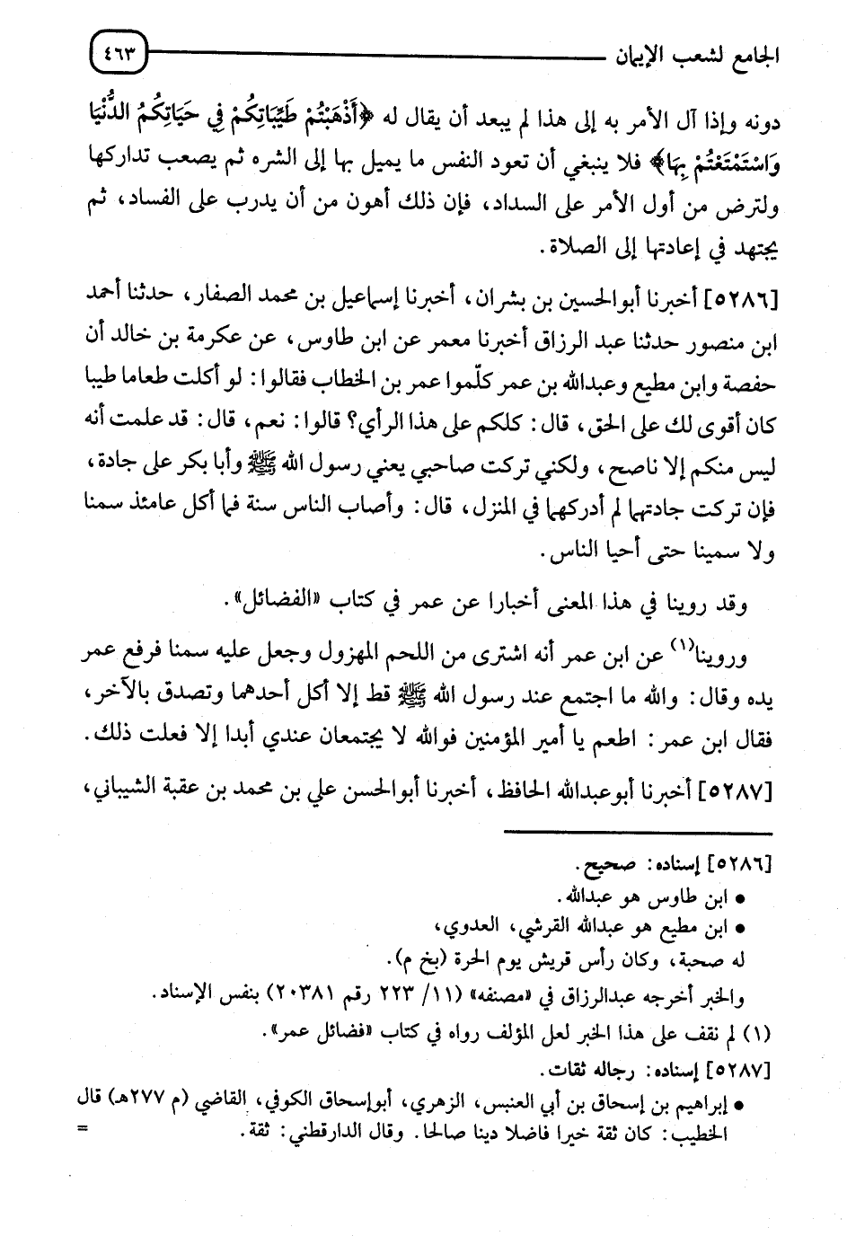 5286 - أَخْبَرَنَا أَبُو الْحُسَيْنِ بْنُ بِشْرَانَ، أَنَا إِسْمَاعِيلُ بْنُ مُحَمَّدٍ الصَّفَارُ، ثَنَا أَحْمَدُ بْنُ مَنْصُورٍ، ثَنَا عَبْدُ الرَّزَّاقِ، أَنَا مَعْمَرٌ، عَنِ ابْنِ طَاوُسَ، عَنْ عِكْرِمَةَ بْنِ خَالِدٍ: أَنَّ حَفْصَةَ، وَابْنَ مُطِيعٍ، وَعَبْدَ اللهِ بْنَ عُمَرَ، كَلَّمُوا عُمَرَ بْنَ الْخَطَّابِ فَقَالُوا: لَوْ أَكَلْتَ طَعَامًا طَيِّبًا كَانَ أَقْوَى لَكَ عَلَى الْحَقِّ، قَالَ: أَكُلُّكُمْ عَلَى هَذَا الرَّأْيِ؟ قَالُوا: نَعَمْ، قَالَ: قَدْ عَلِمْتُ أَنَّهُ لَيْسَ مِنْكُمْ إِلَّا نَاصِحٌ وَلَكِنِّي تَرَكْتُ صَاحِبِي، يَعْنِي رَسُولَ اللهِ صَلَّى اللَّهُ عَلَيْهِ وَسَلَّمَ، وَأَبَا بَكْرٍ عَلَى جَادَّةٍ، فَإِنْ تَرَكْتُ جَادَّتَهُمَا لَمْ أُدْرِكْهُمَا فِي الْمَنْزِلِ، قَالَ: وَأَصَابَ النَّاسَ سَنَةٌ، فَمَا آكِلٌ عَامَئِذٍ سَمْنًا وَلَا سَمِينًا حَتَّى أَحْيَى النَّاسُ " وَقَدْ رُوِّينَا فِي هَذَا الْمَعْنَى أَخْبَارًا، عَنْ عُمَرَ فِي كِتَابِ الْفَضَائِلِ، وَرُوِّينَا عَنِ ابْنِ عُمَرَ أَنَّهُ: اشْتَرَى مِنَ اللَّحْمِ الْمَهْزُولَ، وَحَمَلَ عَلَيْهِ سَمِينًا، فَرَفَعَ عُمَرُ يَدَهُ، وَقَالَ: " وَاللهِ §مَا اجْتَمَعَتَا عِنْدَ رَسُولِ اللهِ صَلَّى اللَّهُ عَلَيْهِ وَسَلَّمَ قَطُّ، إِلَّا أَكَلَ أَحَدَهُمَا وَتَصَدَّقَ بِالْآخَرِ فَقَالَ ابْنُ عُمَرَ: أَطْعِمْ يَا أَمِيرَ الْمُؤْمِنِينَ، فَوَاللهِ لَا يَجْتَمِعَانِ عِنْدِي أَبَدًا، إِلَّا فَعَلْتُ ذَلِكَ